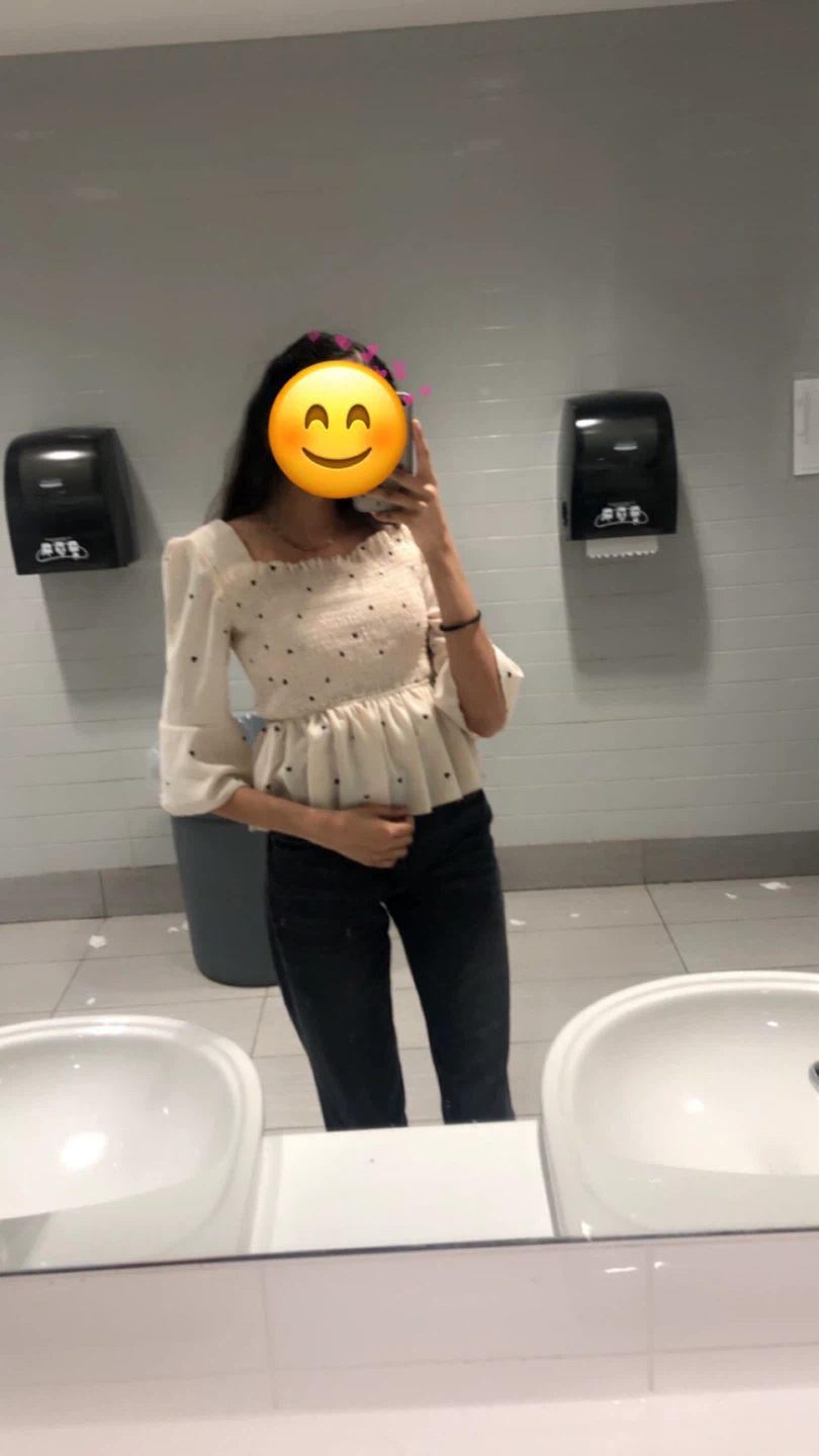 Cream coloured top with black polka dots. It has a smocked bodice and flowy peplum hem. Bell sleeves add a nice touch. This top is great for casual outings!