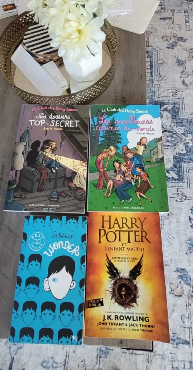 This is a set of four books, including two from 'Le Club des Baby-Sitters' ('Nos dossiers TOP-SECRET' and 'Les meilleures copines du monde'), 'Wonder' by R.J. Palacio, and 'Harry Potter et l'enfant maudit'. These books are in French. 25$ all