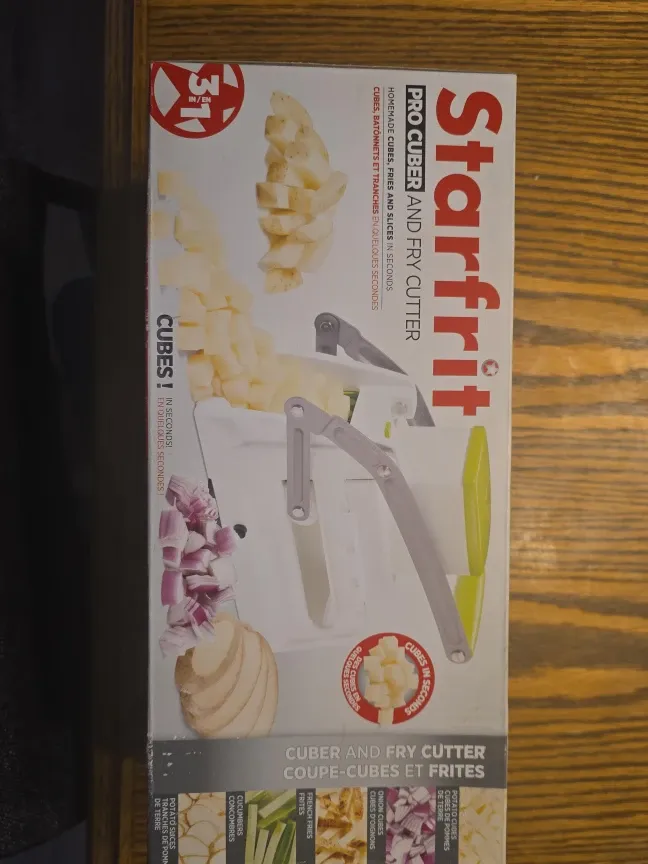 I'm selling a Starfrit Pro Cuber and Fry Cutter! It makes homemade cubes, fries, and slices in seconds. You can make cubes, batonnets, and tranches quickly. It can cube potatoes, onions, and cucumbers, and even make french fries!