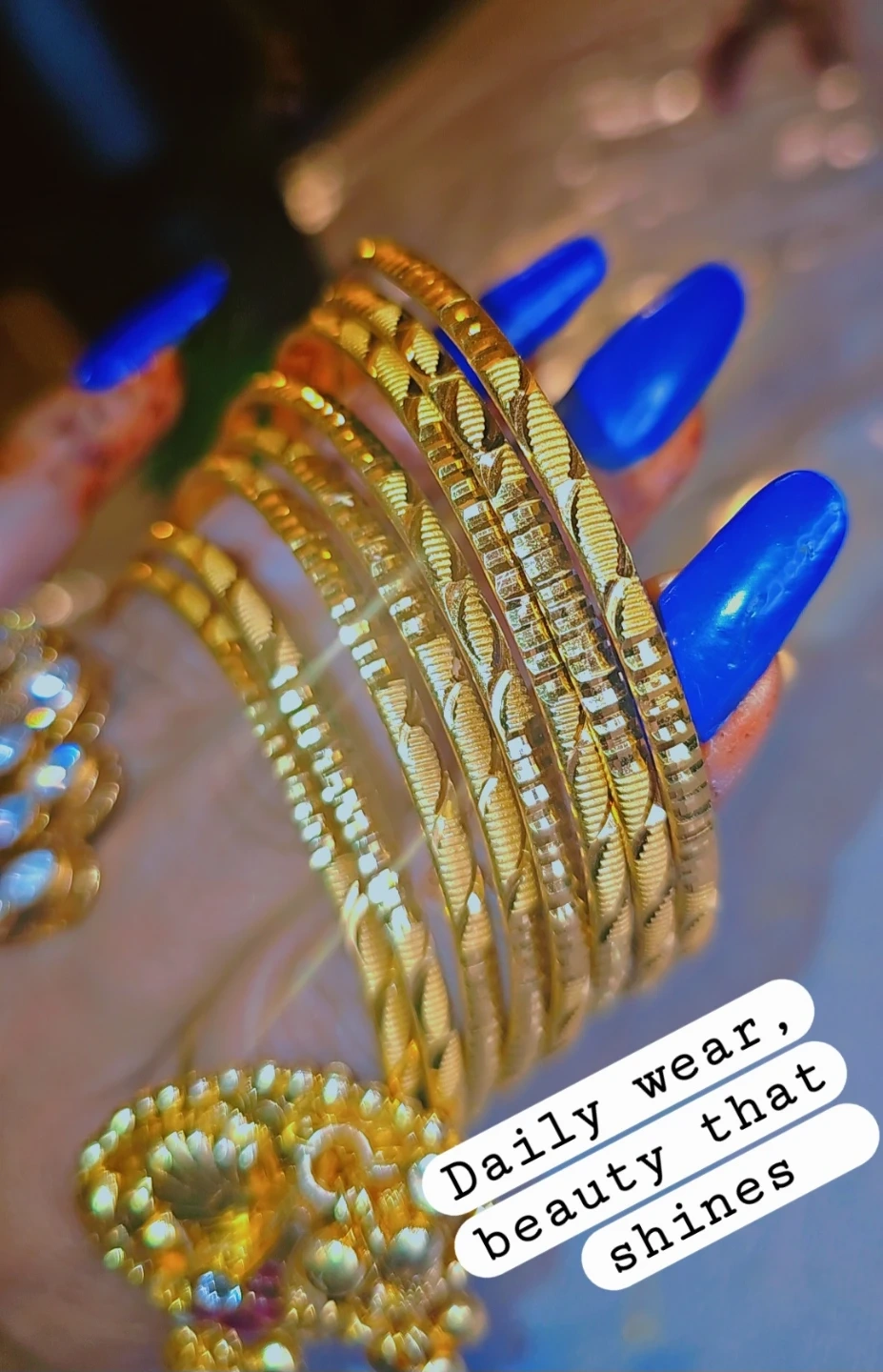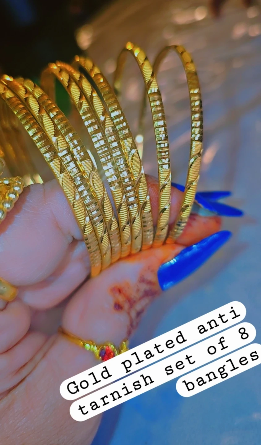 This is a set of 8 gold-plated bangles with an anti-tarnish finish. They feature a detailed pattern design. These bangles are perfect for daily wear, adding a touch of shine to your look. The gold plating ensures they maintain their beauty over time.$57