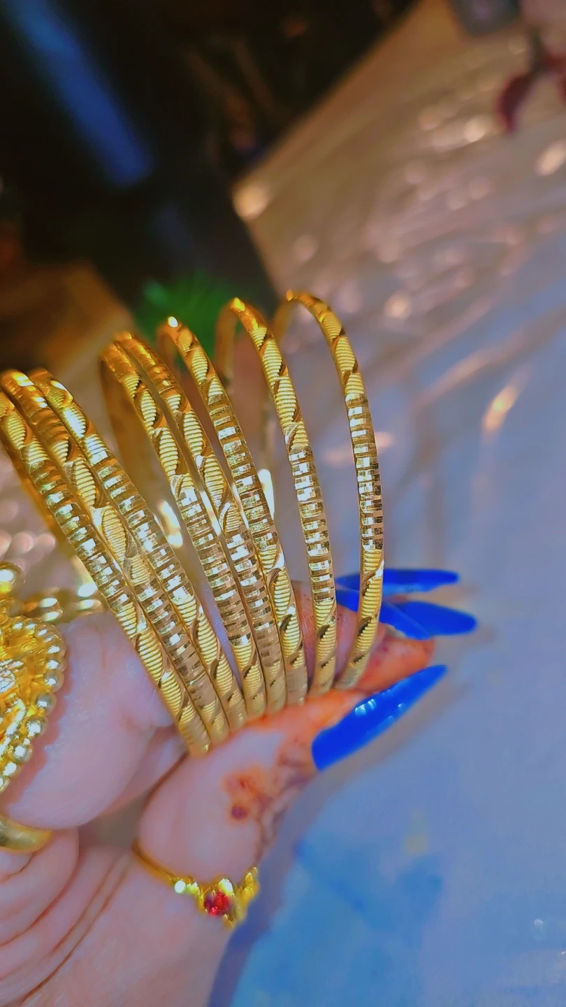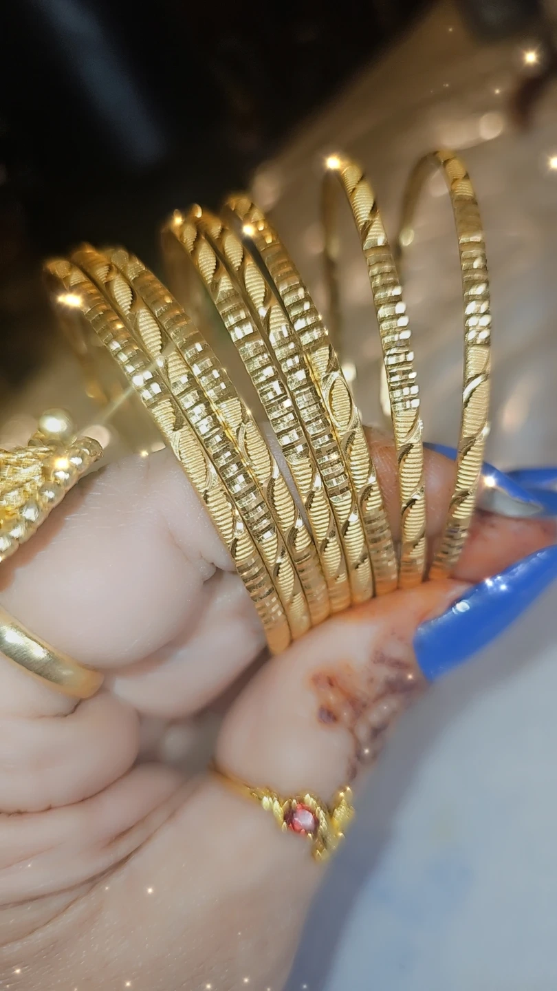 This is a set of 8 gold-plated bangles with an anti-tarnish finish. They feature a detailed pattern design. These bangles are perfect for daily wear, adding a touch of shine to your look. The gold plating ensures they maintain their beauty over time.$57