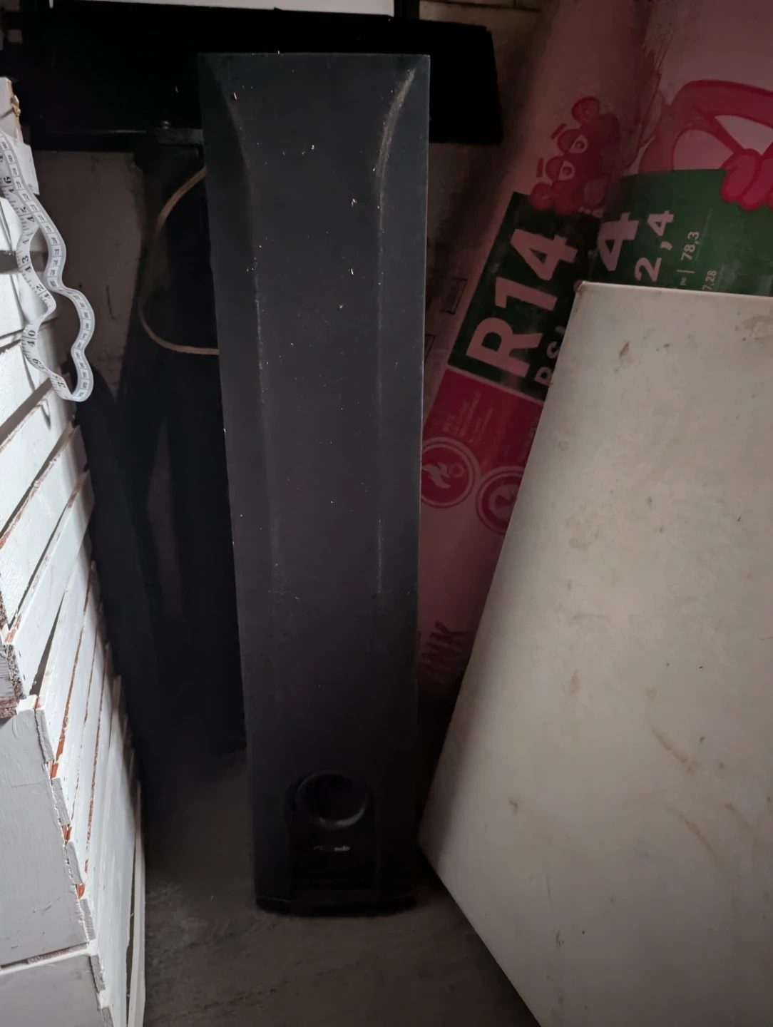 This is a black floor-standing speaker. It has a circular port at the bottom. I have 2 units, each for $55 perfect for adding to your home audio setup