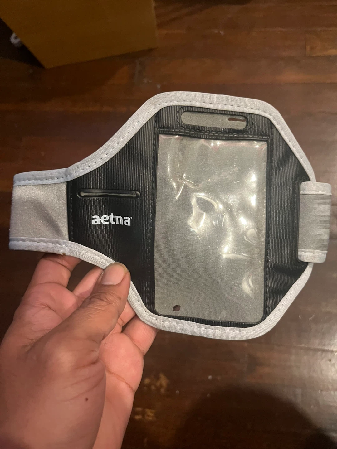 This Aetna armband phone holder is designed for workouts. It's made of durable material and has a clear window for touchscreen access. Keep your phone secure while you exercise!