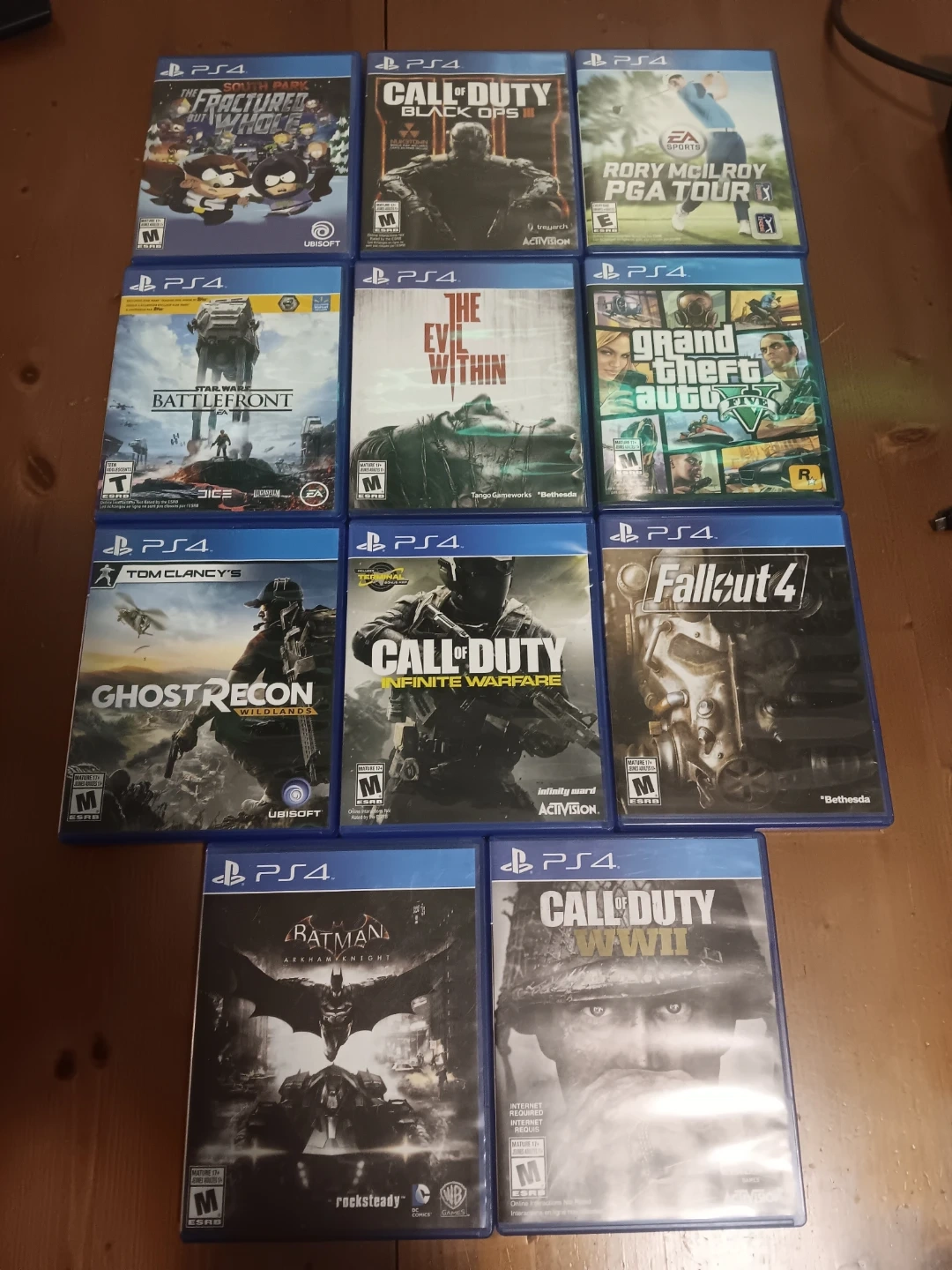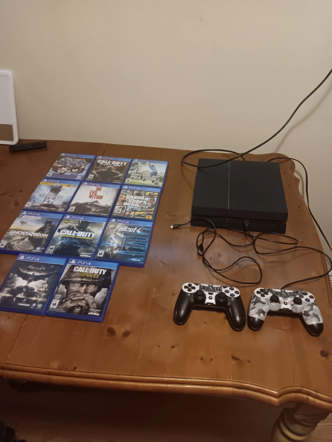 Selling a PlayStation 4 console, comes with two controllers and nine games. Games included are: The Fractured But Whole, Black Ops III, Rory McIlroy PGA Tour, Star Wars Battlefront, The Evil Within, Grand Theft Auto V, Ghost Recon, Infinite Warfare, and Fallout 4. This bundle is ready for hours of gaming fun!