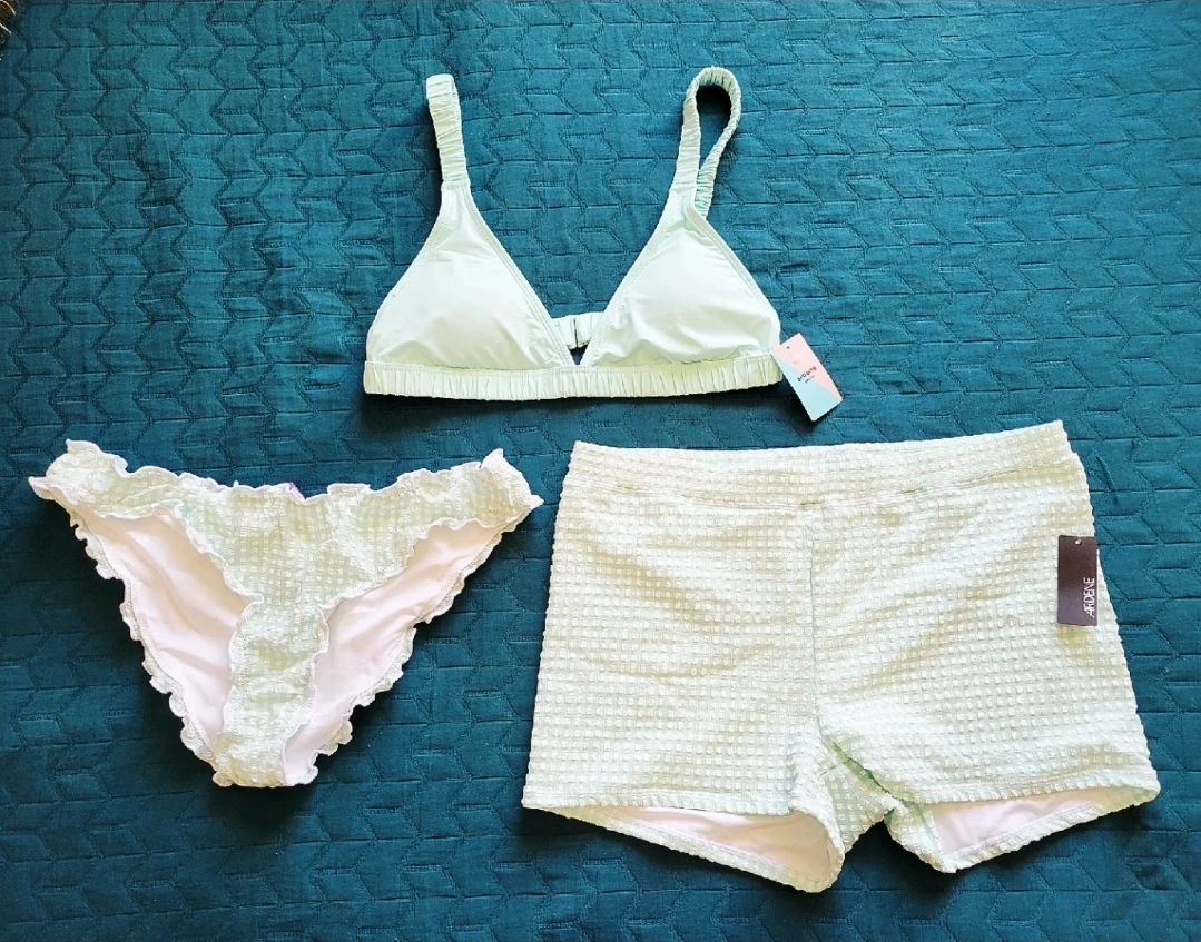 This is a three-piece swimsuit set from Ardene. It includes a bikini top, bikini bottoms, and swim shorts. The set is a mint green colour. Made in China.