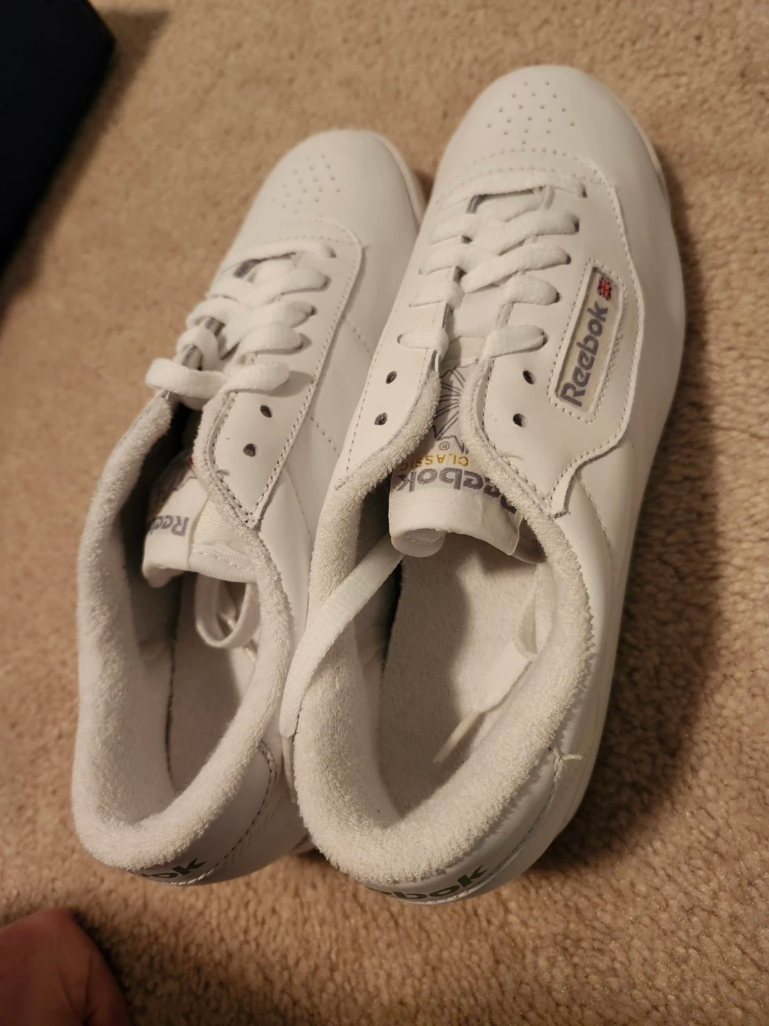 White Reebok Princess Classic sneakers for women. Leather upper with a rubber sole. Includes original box. These are a size 9 US. New condition.