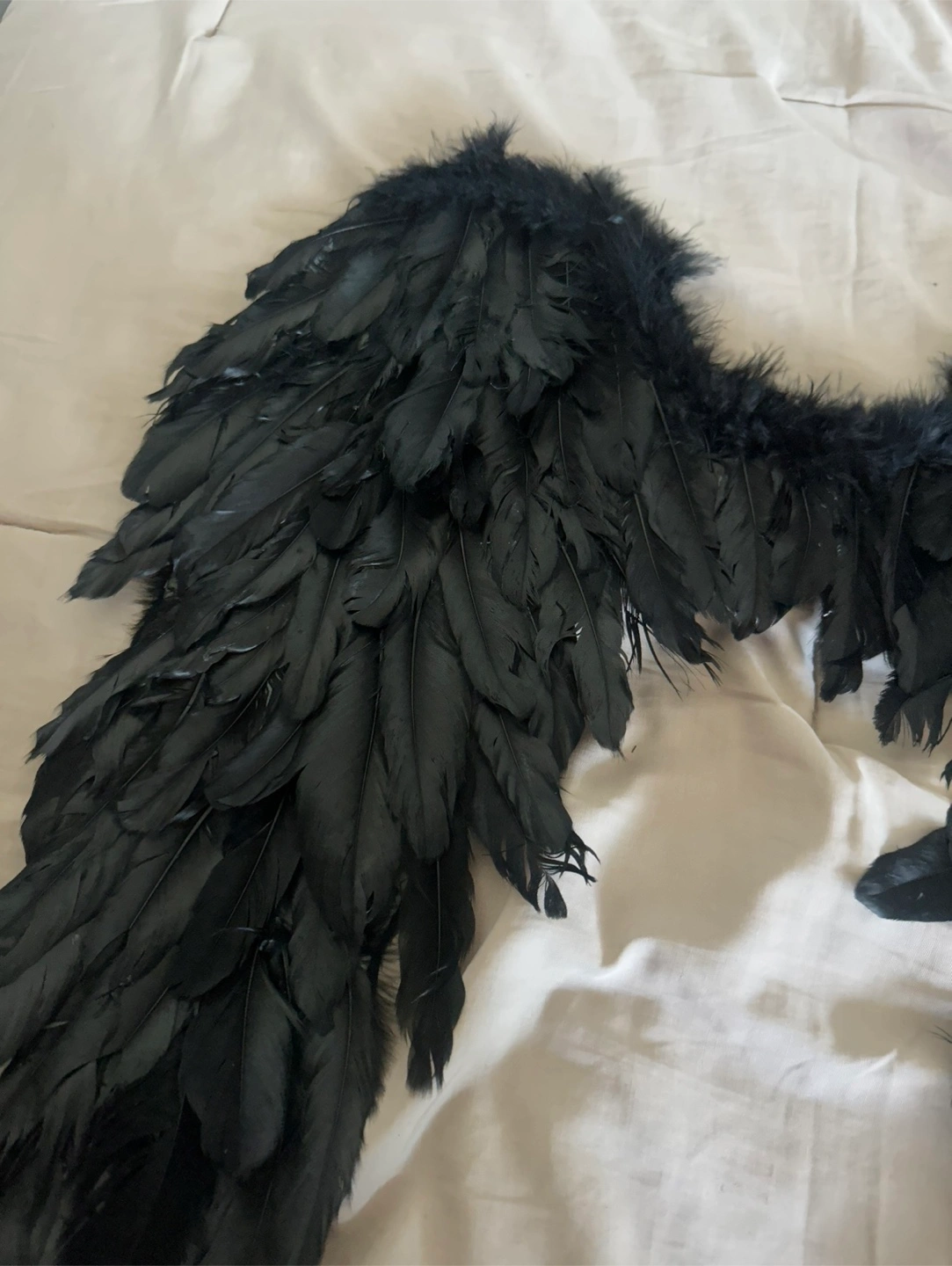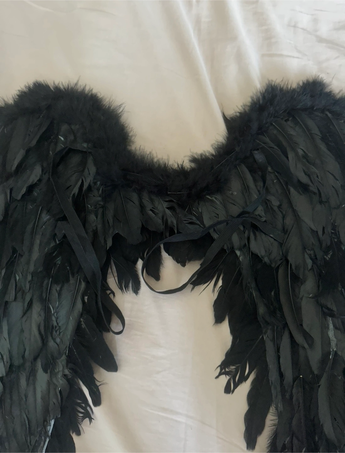Black feather angel wings - a striking accessory perfect for Halloween, cosplay, themed parties, or photoshoots. Lightweight and comfortable to wear. The wings add a dramatic and stylish touch to any costume. Pickup available in North York