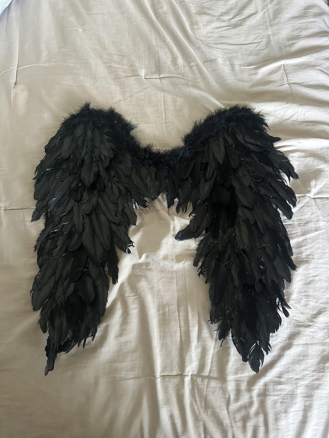 Black feather angel wings - a striking accessory perfect for Halloween, cosplay, themed parties, or photoshoots. Lightweight and comfortable to wear. The wings add a dramatic and stylish touch to any costume. Pickup available in North York