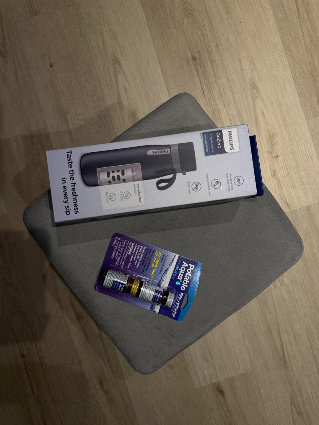 Selling a Philips GoZero Everyday Bottle with an everyday filter that reduces chlorine and particles, so you can taste the freshness in every sip! It's BPA-free and made of food-grade stainless steel. Also included are Potable Aqua water purification tablets with PA+Plus technology, perfect for camping, hiking, or travel