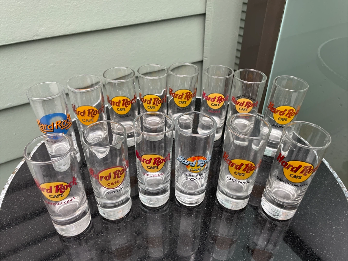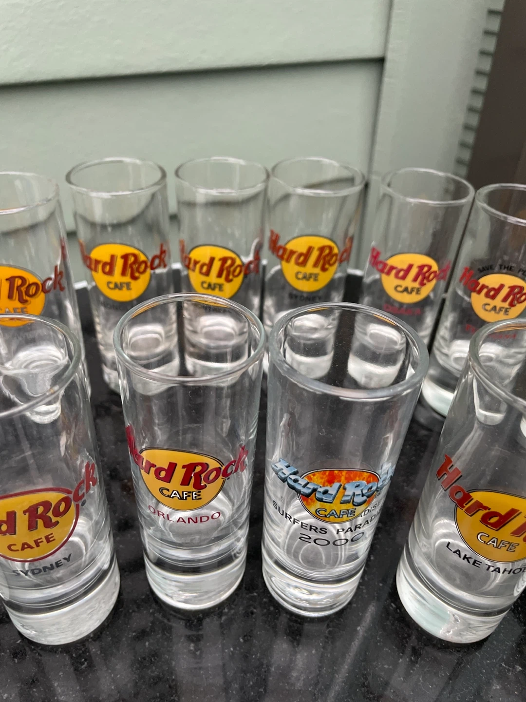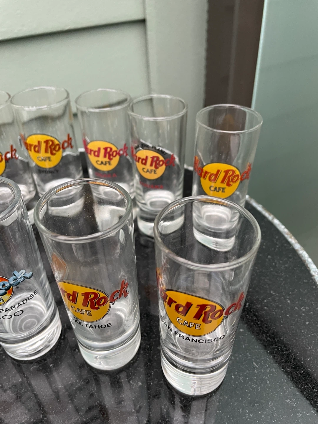 Selling a collection of Hard Rock Cafe shot glasses! They feature different city locations. A great addition for any collector or fan of the Hard Rock Cafe. Price is for them all. Great condition