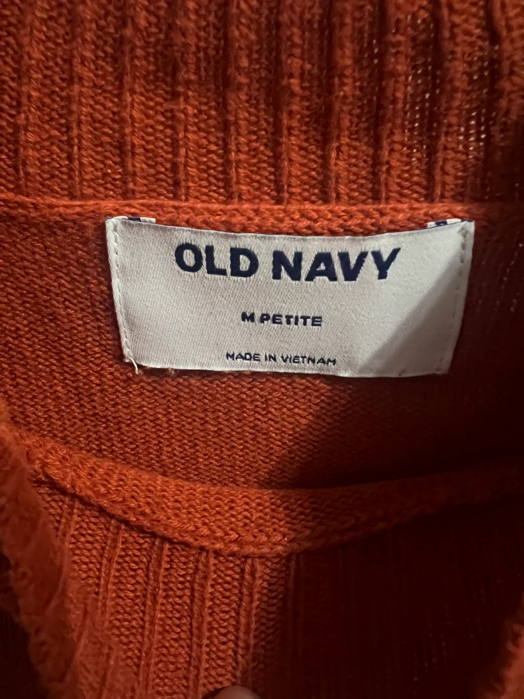 Orange mock neck sweater from Old Navy. Size M Petite. Made of 100% cotton. Machine wash cold gentle cycle, wash inside out, only non-chlorine bleach when needed, dry flat, warm iron. So soft and cozy!