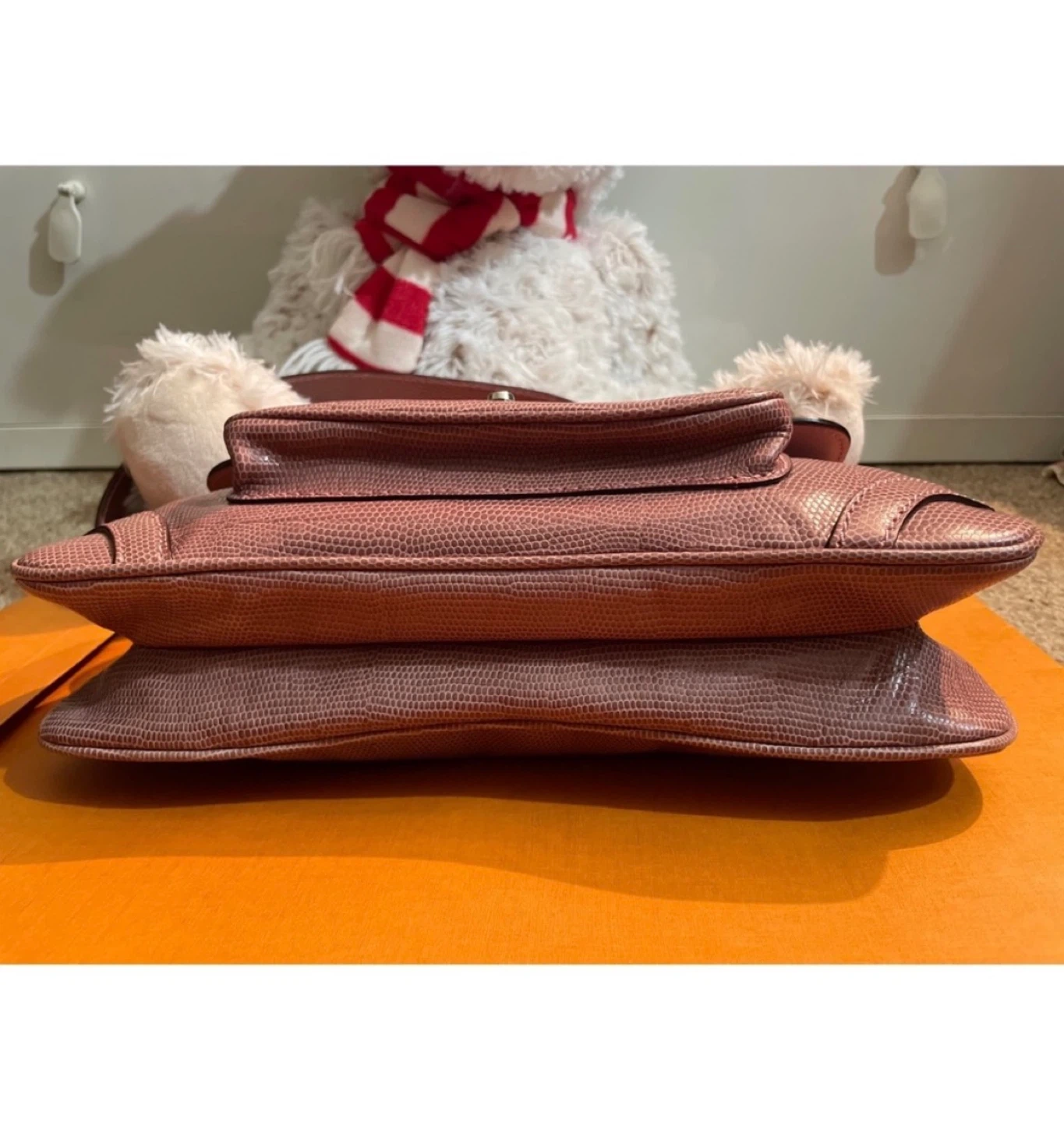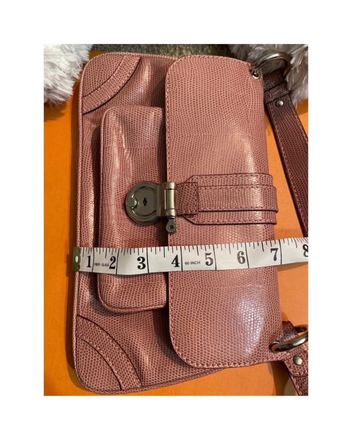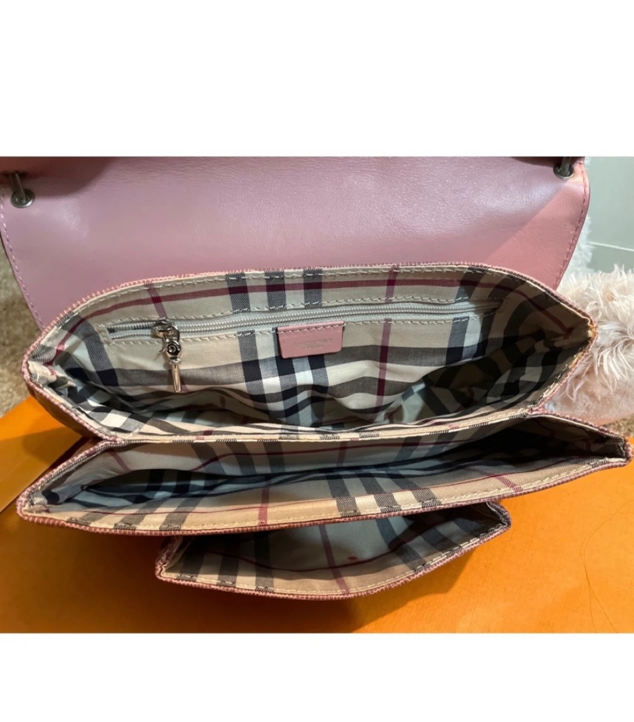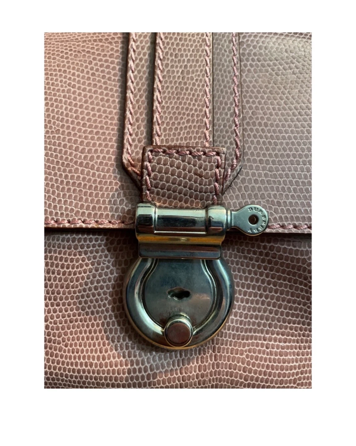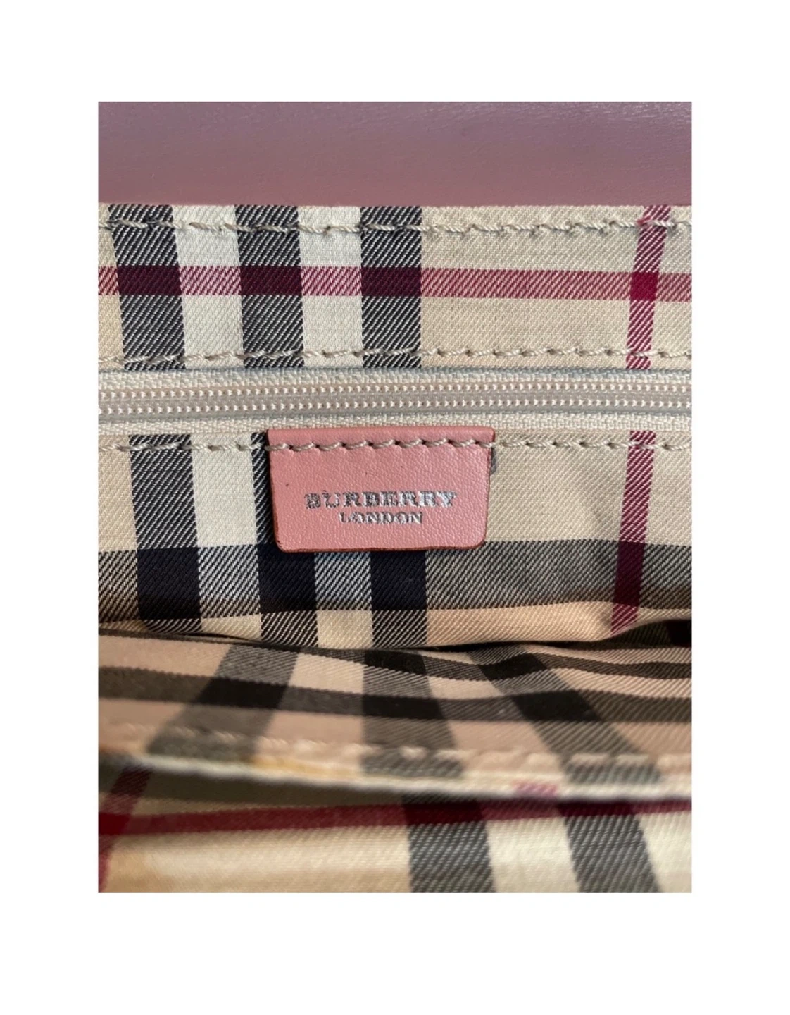 A classic Burberry London shoulder bag in a lovely pinkish-mauve colour. It's made with a textured material that mimics lizard skin. The interior features the iconic Nova Check pattern and a zippered compartment for essentials. It's a stylish and practical accessory! No box no dustbag