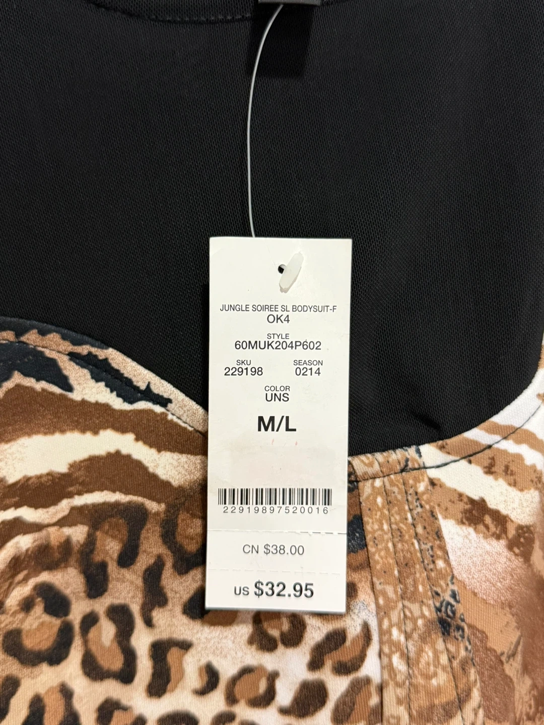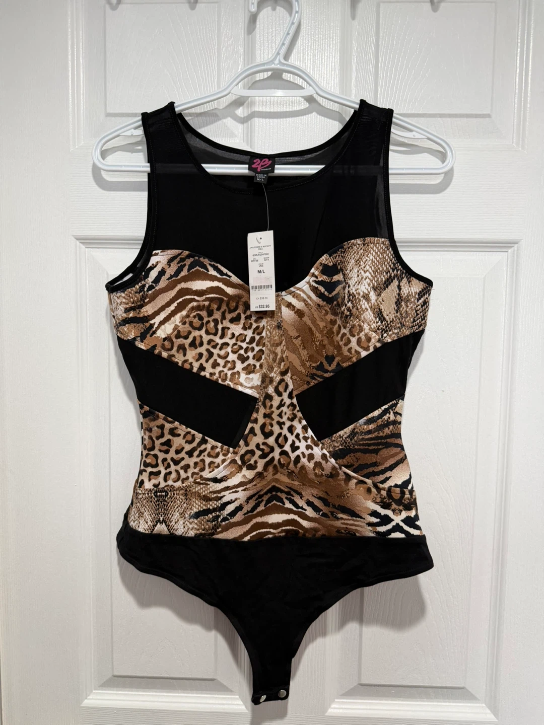 This Bebe bodysuit features a mixed animal print with mesh detailing. It's a size medium/large with a thong bottom. Perfect for layering or wearing on its own