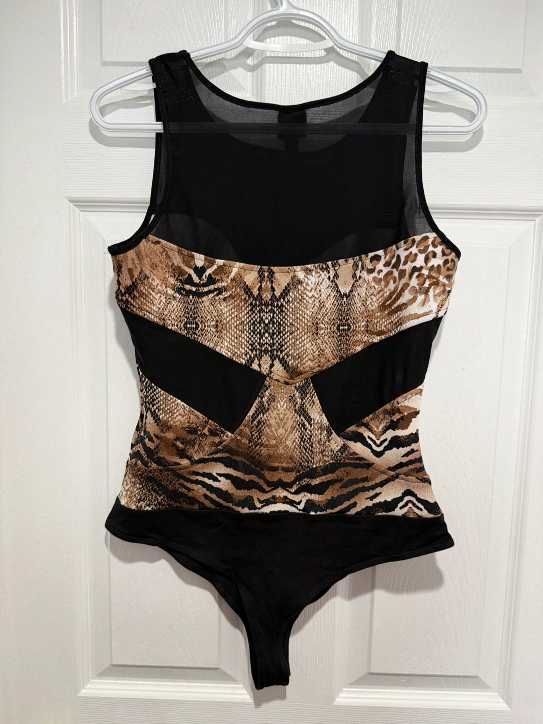 This Bebe bodysuit features a mixed animal print with mesh detailing. It's a size medium/large with a thong bottom. Perfect for layering or wearing on its own