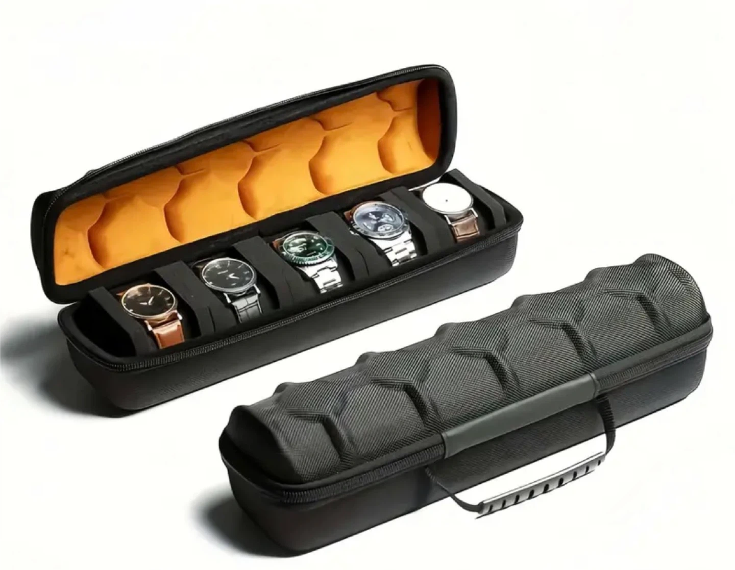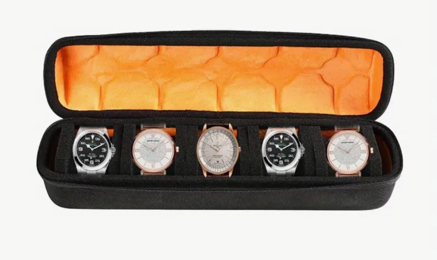 This is a black, hard-shell travel case designed to hold up to six watches. It features a zippered closure and a soft, orange interior with individual slots for each watch. Perfect for safely storing and transporting your watch collection!