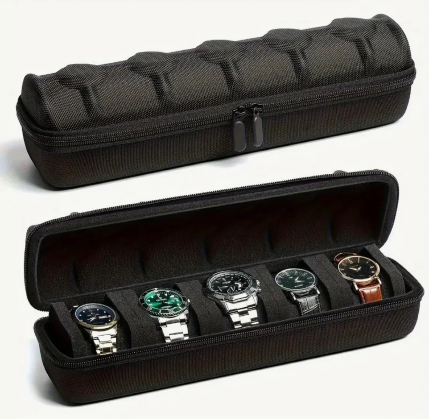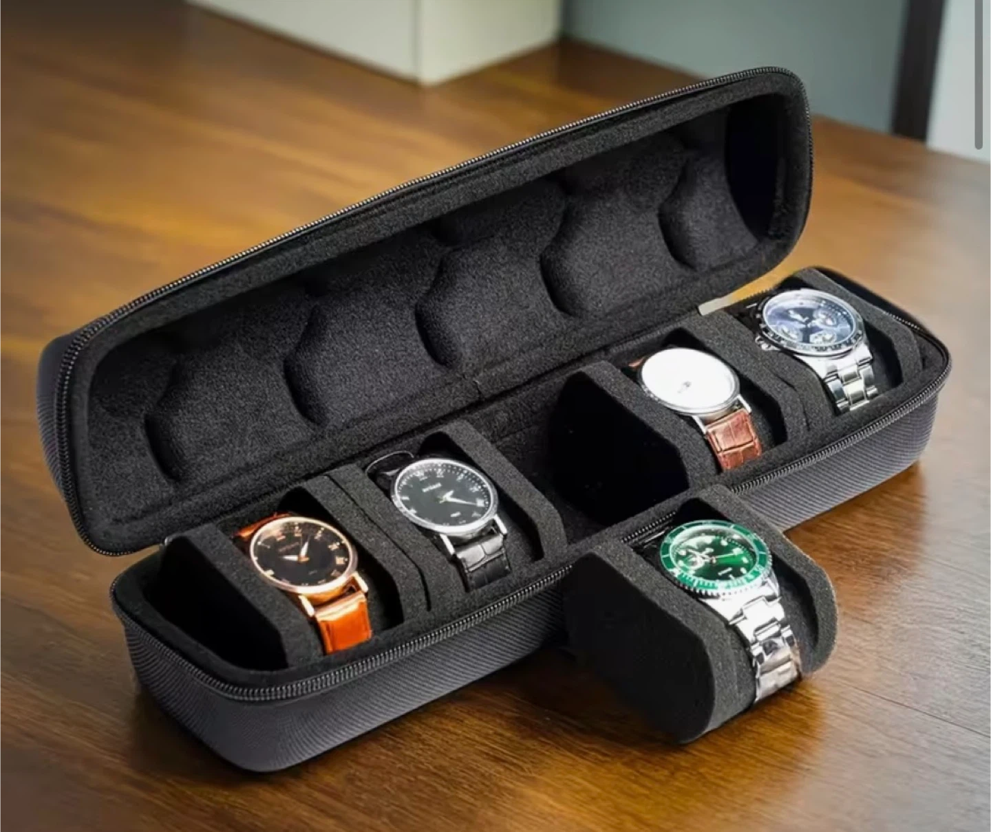 This is a black, hard-shell travel case designed to hold up to six watches. It features a zippered closure and a soft, orange interior with individual slots for each watch. Perfect for safely storing and transporting your watch collection!