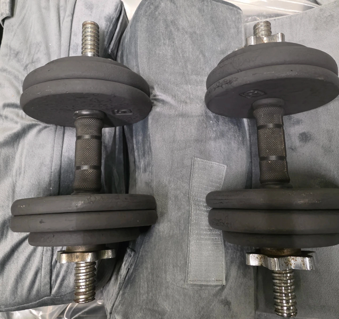 These are a pair of adjustable dumbbells. Each dumbbell (30 pounds) features a textured grip handle and screw-on collars to secure the weight plates. The weight plates are cast iron and coated in black rubber. Great for home workouts!
