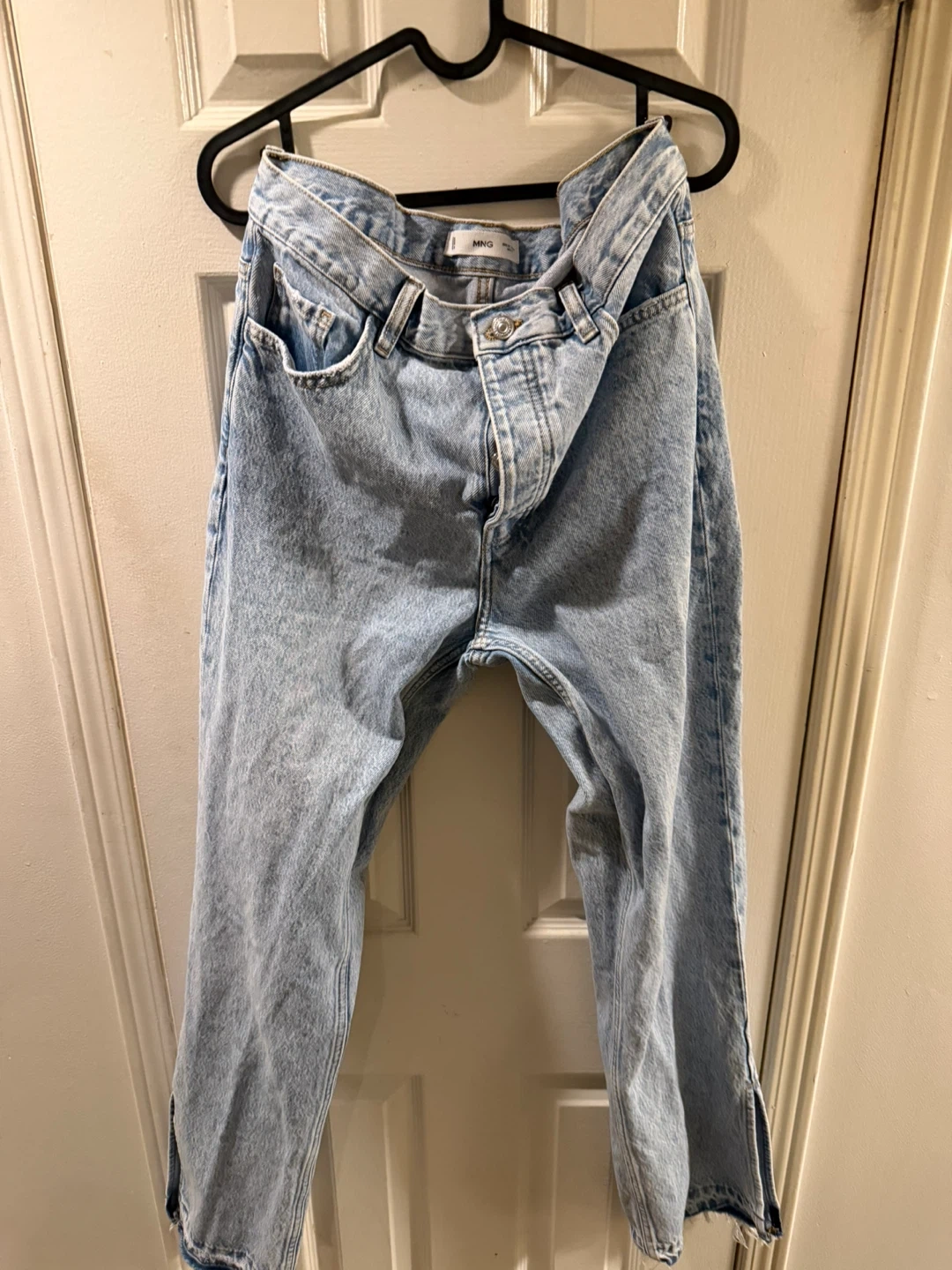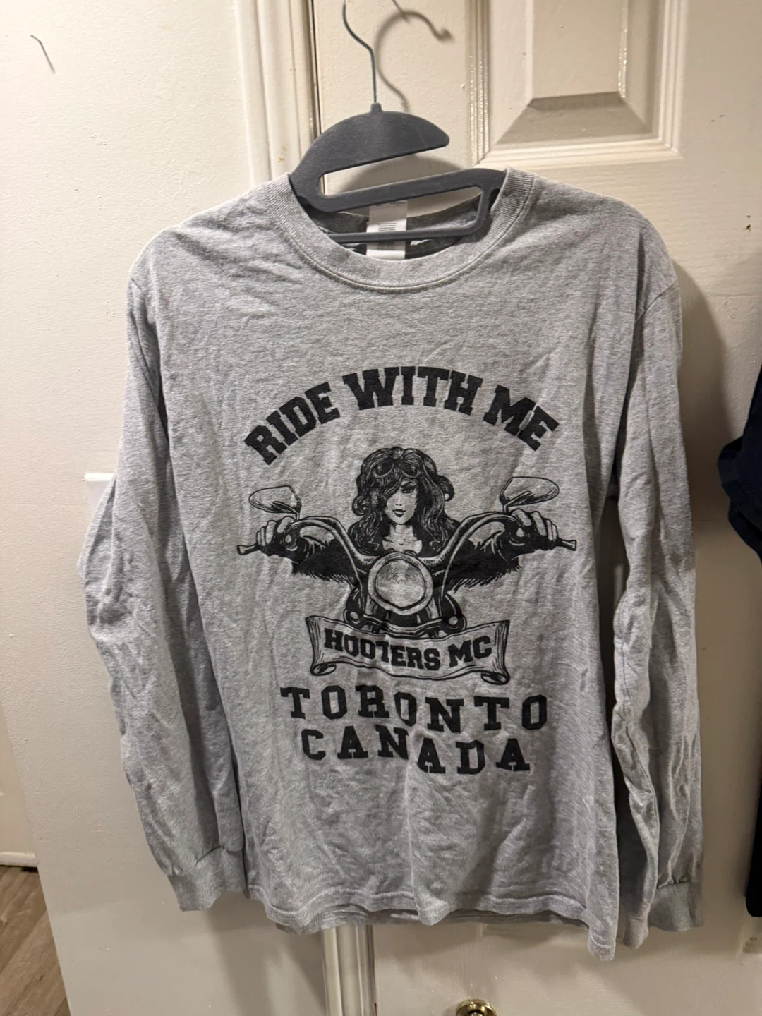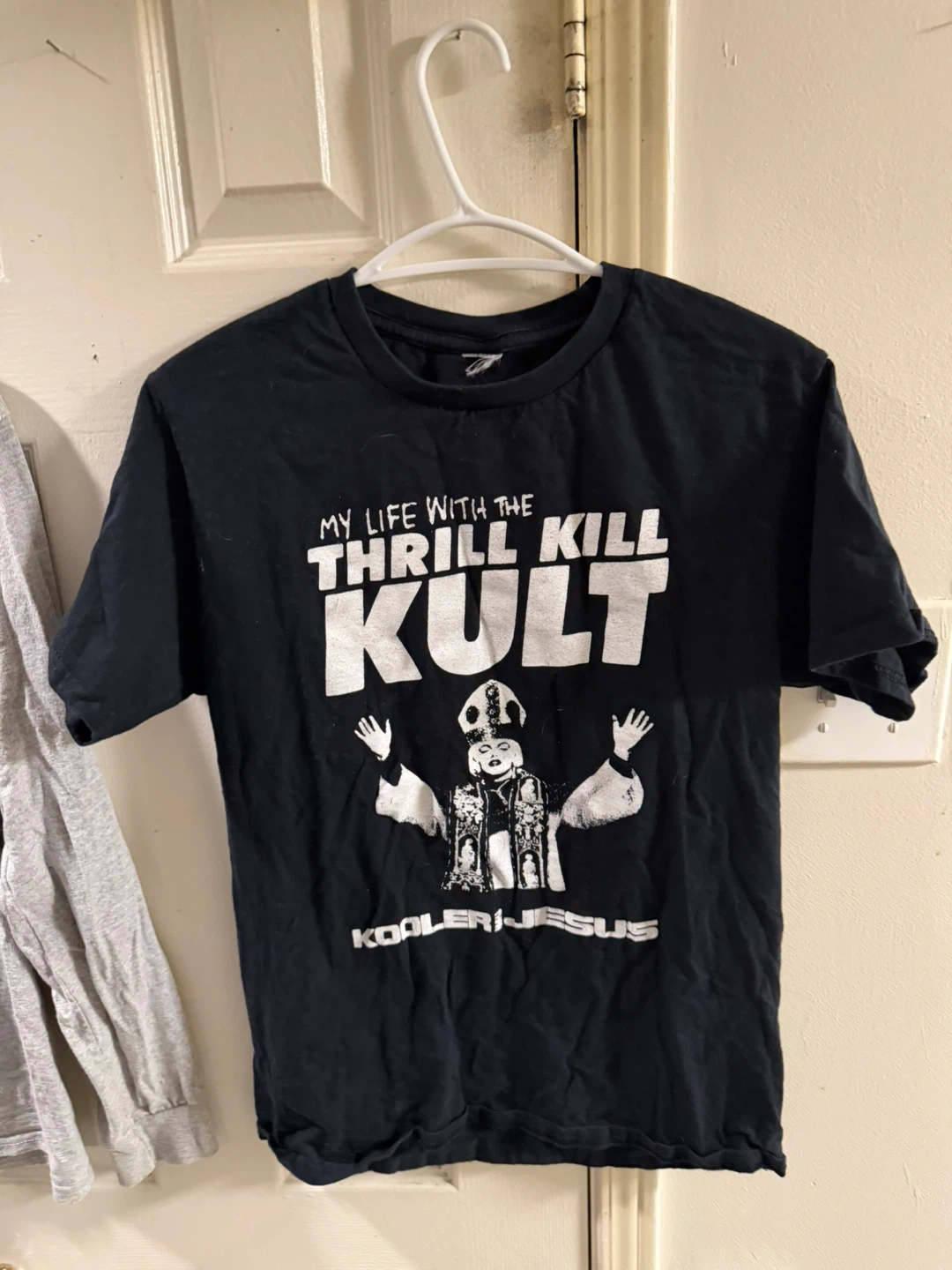 Bundle includes a light wash denim jeans with a button fly, a long-sleeved grey shirt with 'Ride With Me Toronto Canada Hooters MC' graphic, a black t-shirt with 'My Life With The Thrill Kill Kult Kooler-Jesus' graphic, and a black tank top with a 'Bad Conceptual' tag. Jeans are MNG brand. All items are pre-owned.