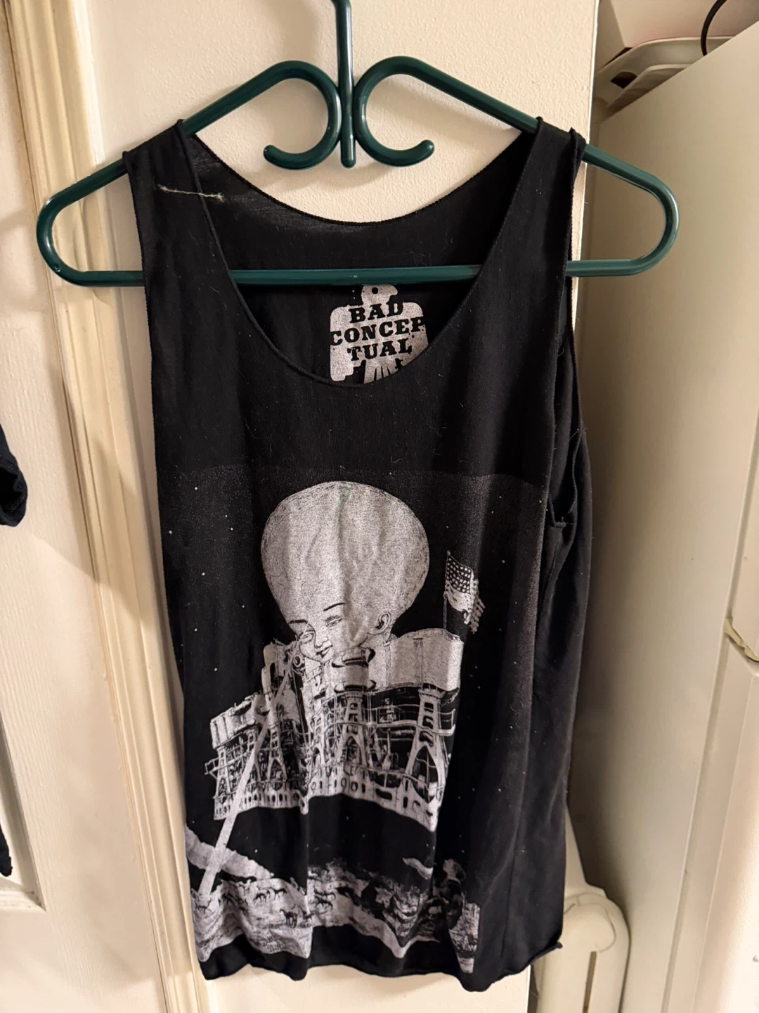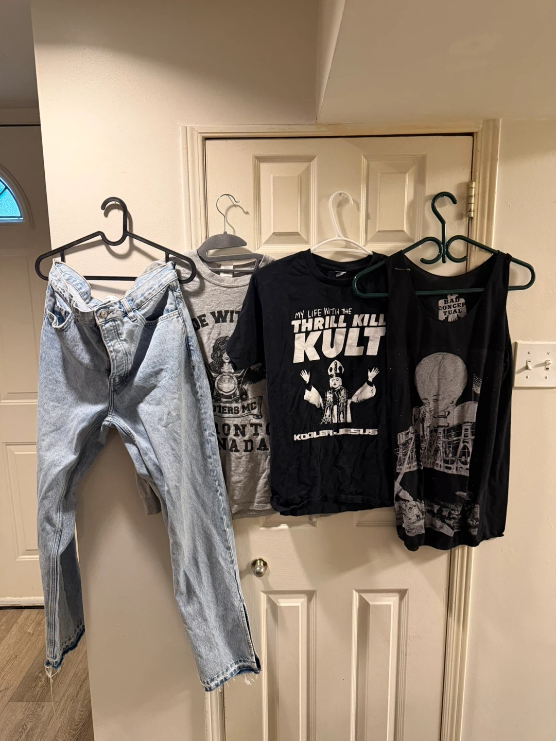 Bundle includes a light wash denim jeans with a button fly, a long-sleeved grey shirt with 'Ride With Me Toronto Canada Hooters MC' graphic, a black t-shirt with 'My Life With The Thrill Kill Kult Kooler-Jesus' graphic, and a black tank top with a 'Bad Conceptual' tag. Jeans are MNG brand. All items are pre-owned.