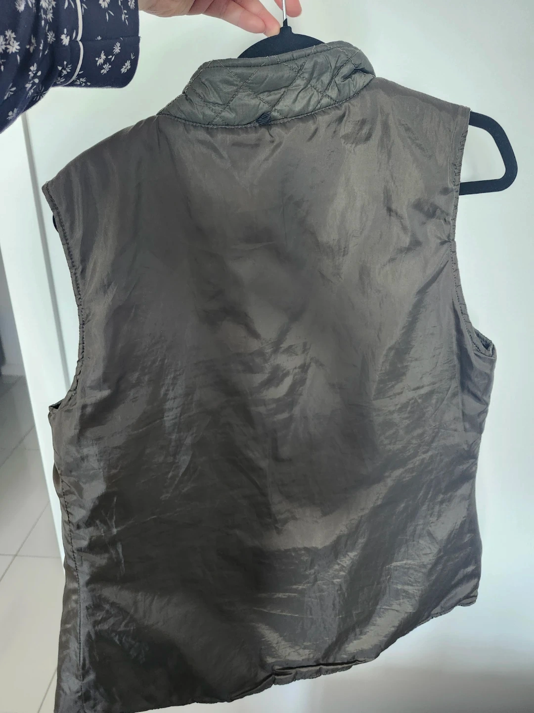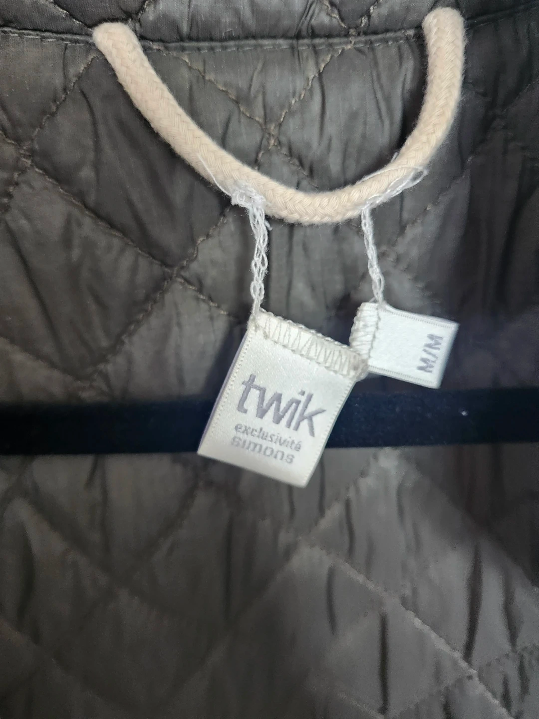 This is a grey quilted vest from Twik, a Simons exclusive. It's a size medium and features a button-up front and a collar. Great for layering!