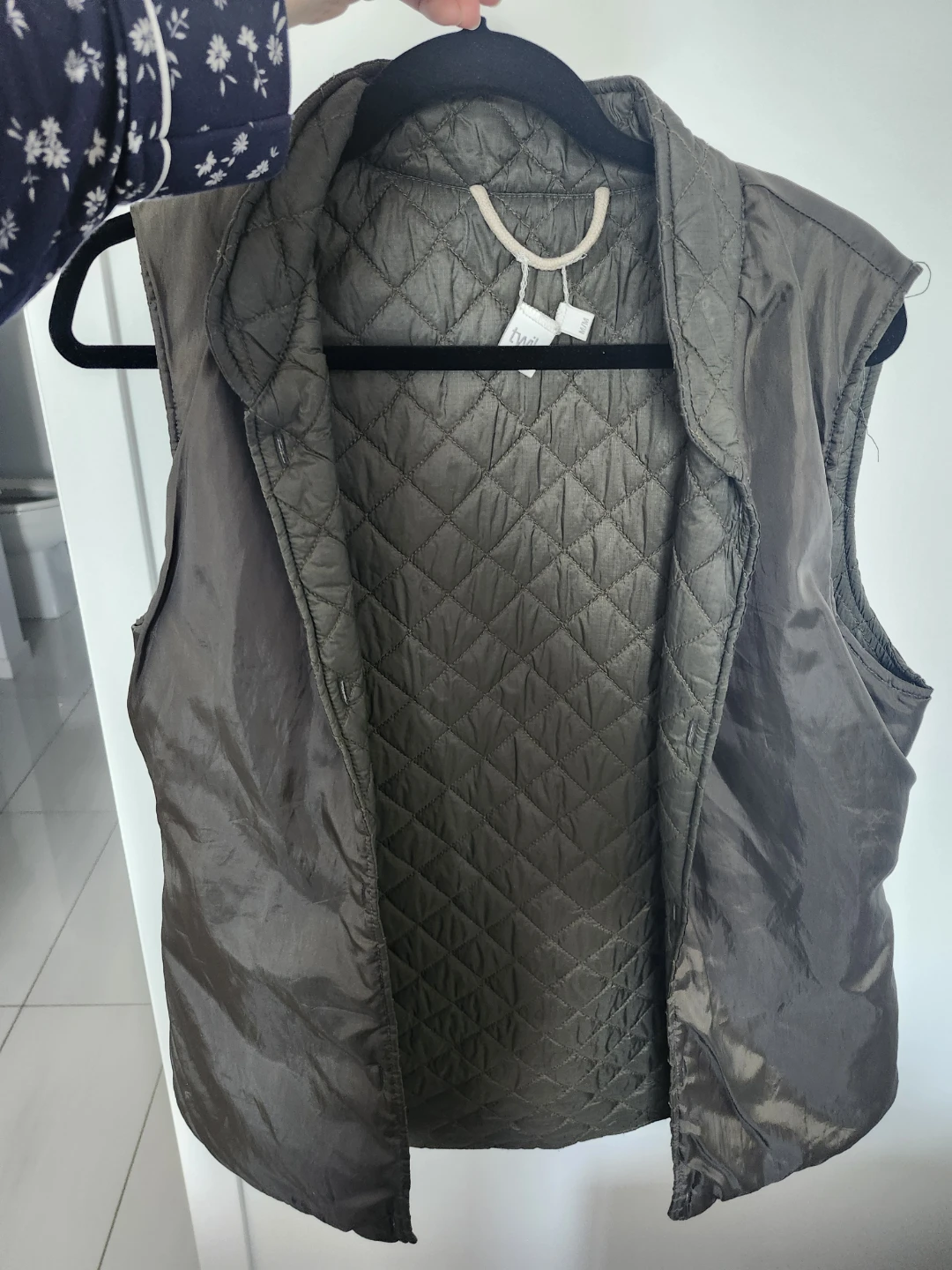 This is a grey quilted vest from Twik, a Simons exclusive. It's a size medium and features a button-up front and a collar. Great for layering!
