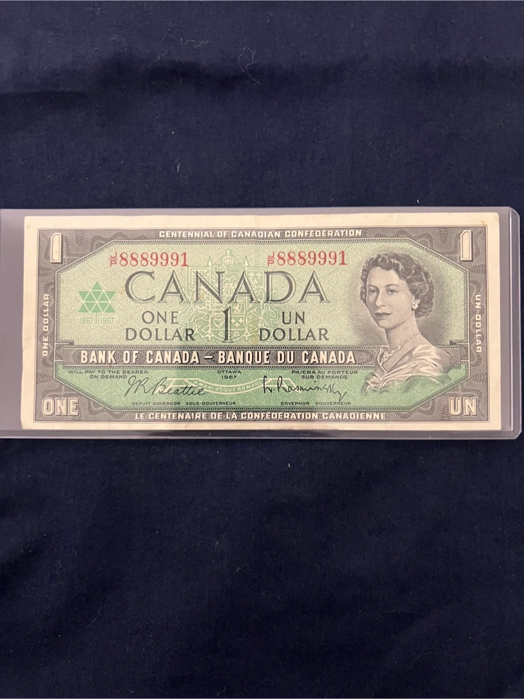 Very cool rate Serial number is 8889991. Bank of Canada one dollar banknote celebrating the Centennial of Canadian Confederation in 1967. Features Queen Elizabeth II on the front and the Centre Block of Parliament Hill on the back. Serial number is 8889991.
