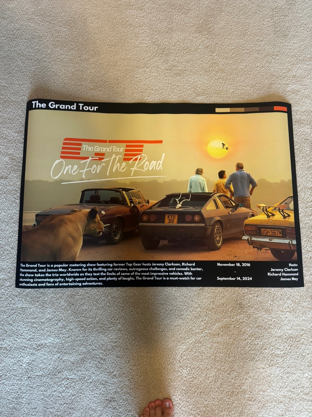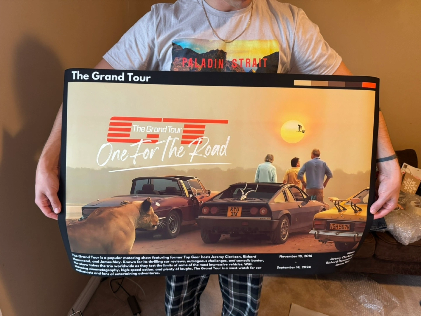 Large format poster featuring the cast of The Grand Tour. Stunning imagery of classic cars and African landscape. Great for any fan of the show.