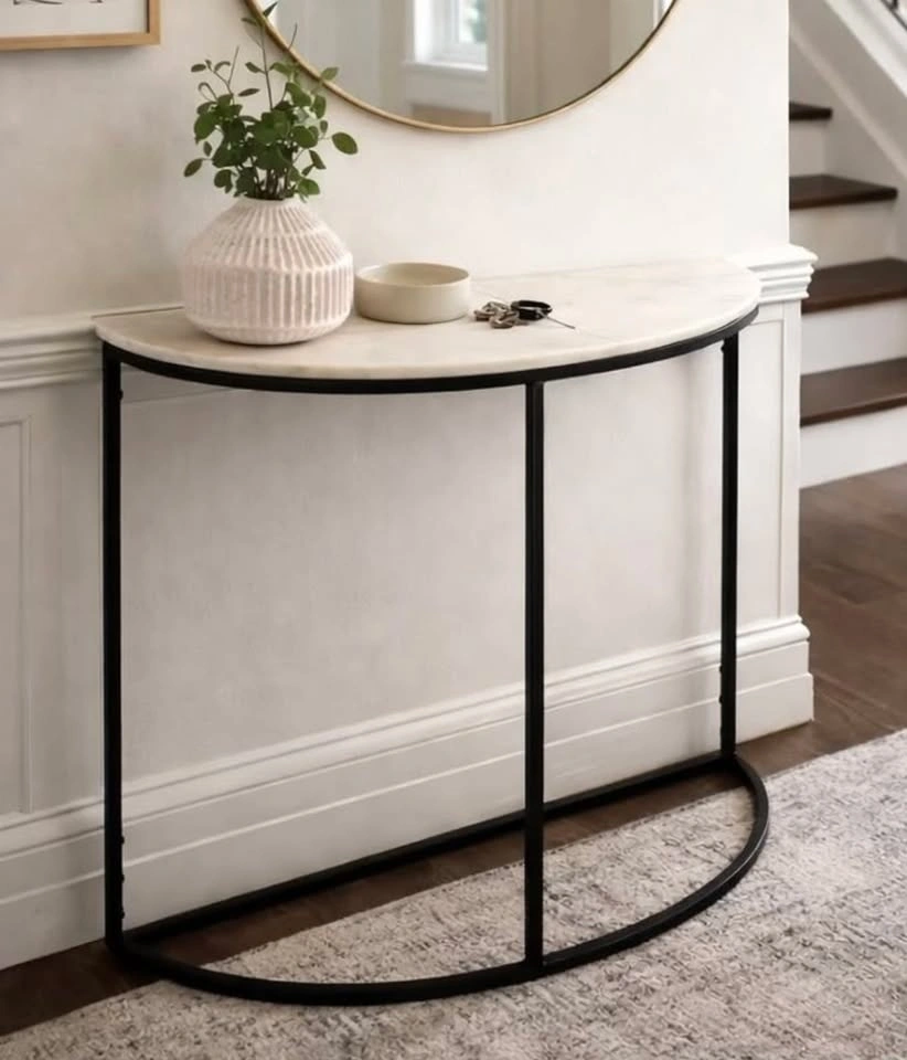 Price: $120, brand new in box. Half-circle console table with a sturdy metal base and durable marble tabletop, designed to fit neatly against a wall and ideal for entryways or small spaces like hallways.