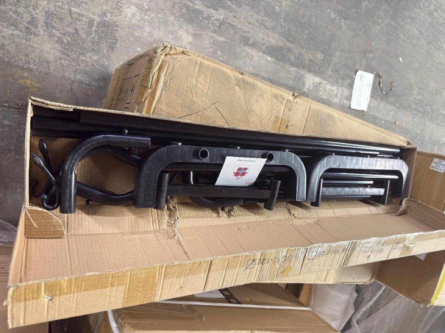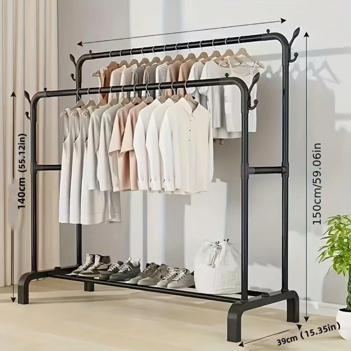Sturdy black metal garment rack with two hanging rods and bottom shelves. Dimensions: 150cm height, 39cm depth. This rack offers ample space for clothes and shoes. It's great for organizing closets or extra storage!