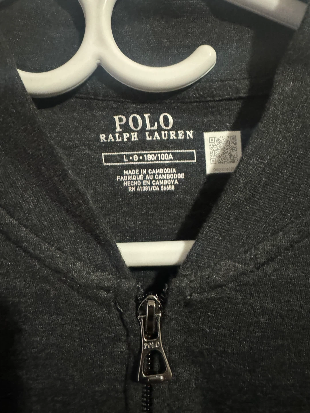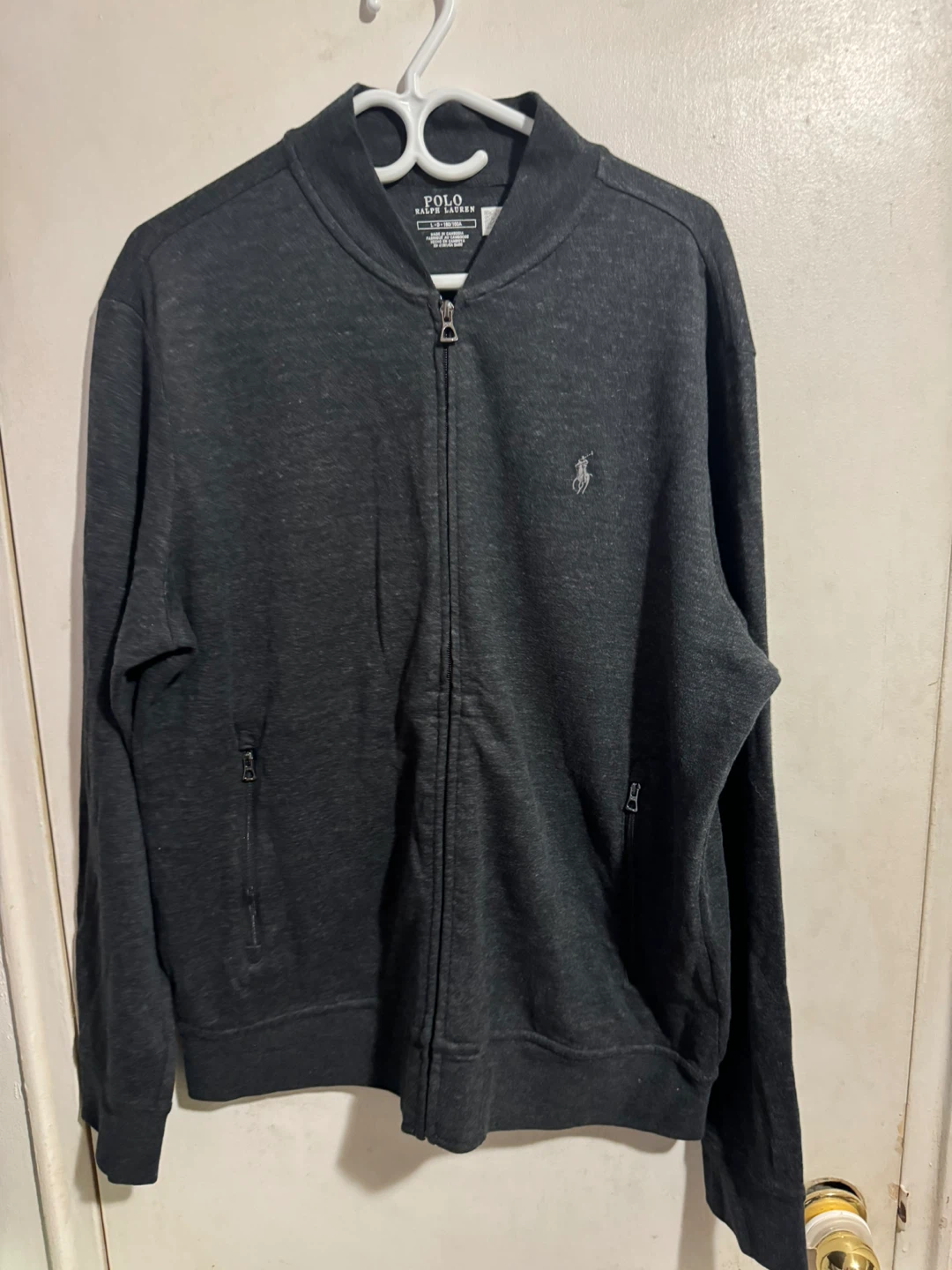 Polo Ralph Lauren zip-up jacket in charcoal grey. Made in Cambodia. It's a size L, fitting 180/100A.