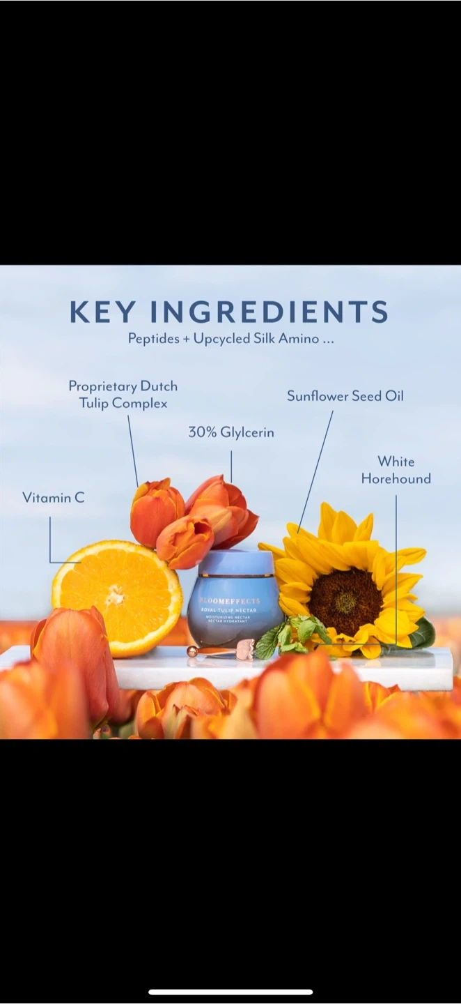 I'm selling a Bloomeffects Royal Tulip Nectar Moisturizer Hydratant. This moisturizer features peptides and upcycled silk amino acids for hydrated skin. It also contains a proprietary Dutch Tulip Complex and 30% Glycerin to help keep your skin moisturized