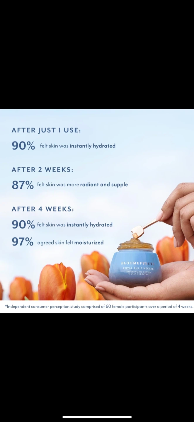 I'm selling a Bloomeffects Royal Tulip Nectar Moisturizer Hydratant. This moisturizer features peptides and upcycled silk amino acids for hydrated skin. It also contains a proprietary Dutch Tulip Complex and 30% Glycerin to help keep your skin moisturized