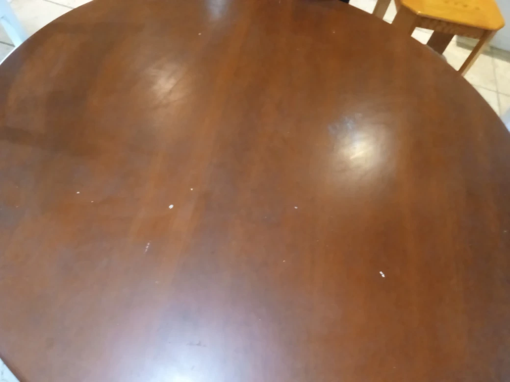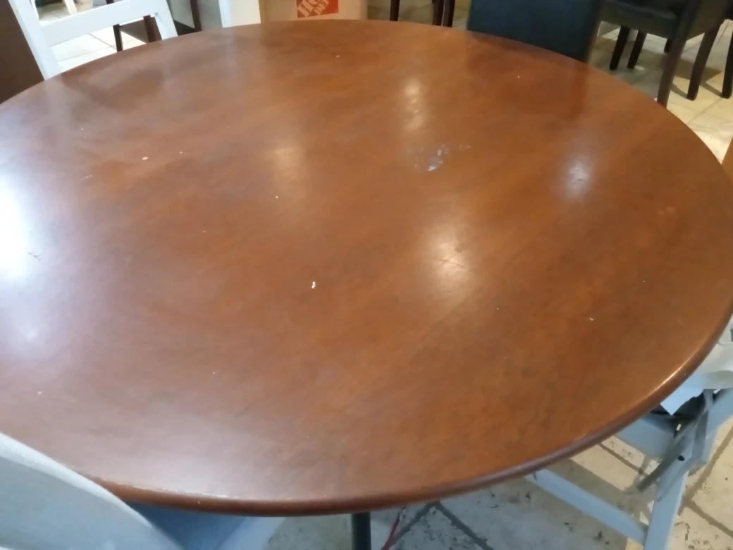 A round wooden dining table with a warm, dark wood finish. Its classic design seats four comfortably. Great for smaller dining spaces! 4 chairs 70 cm high