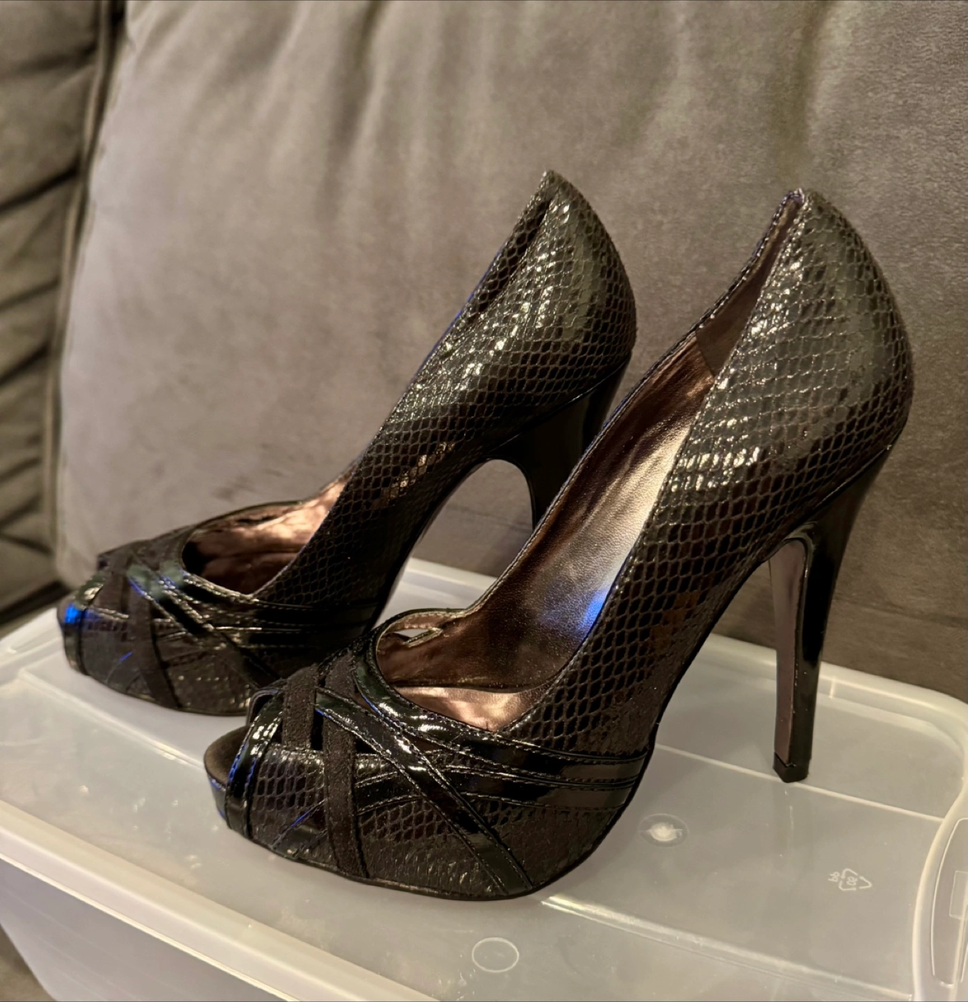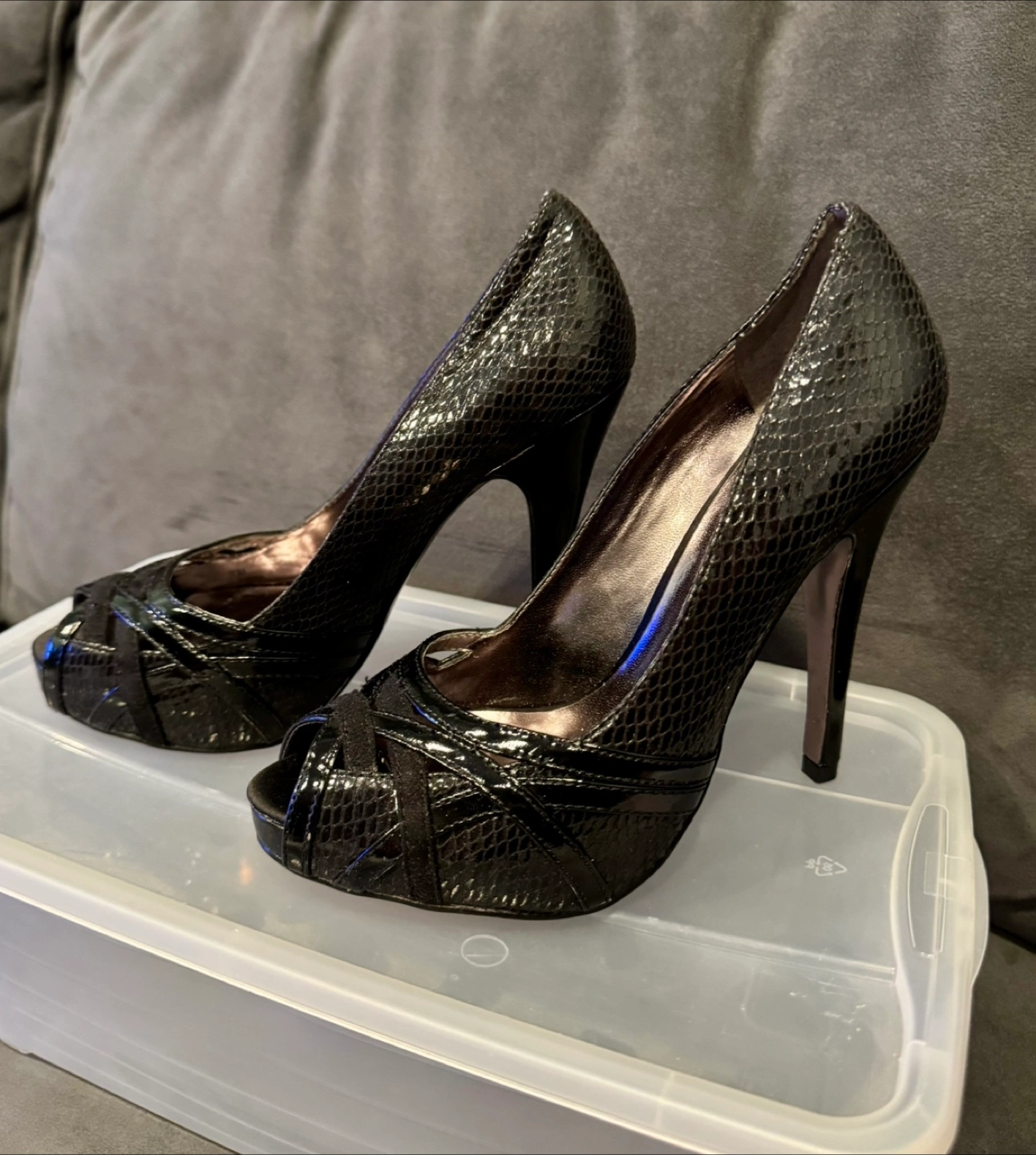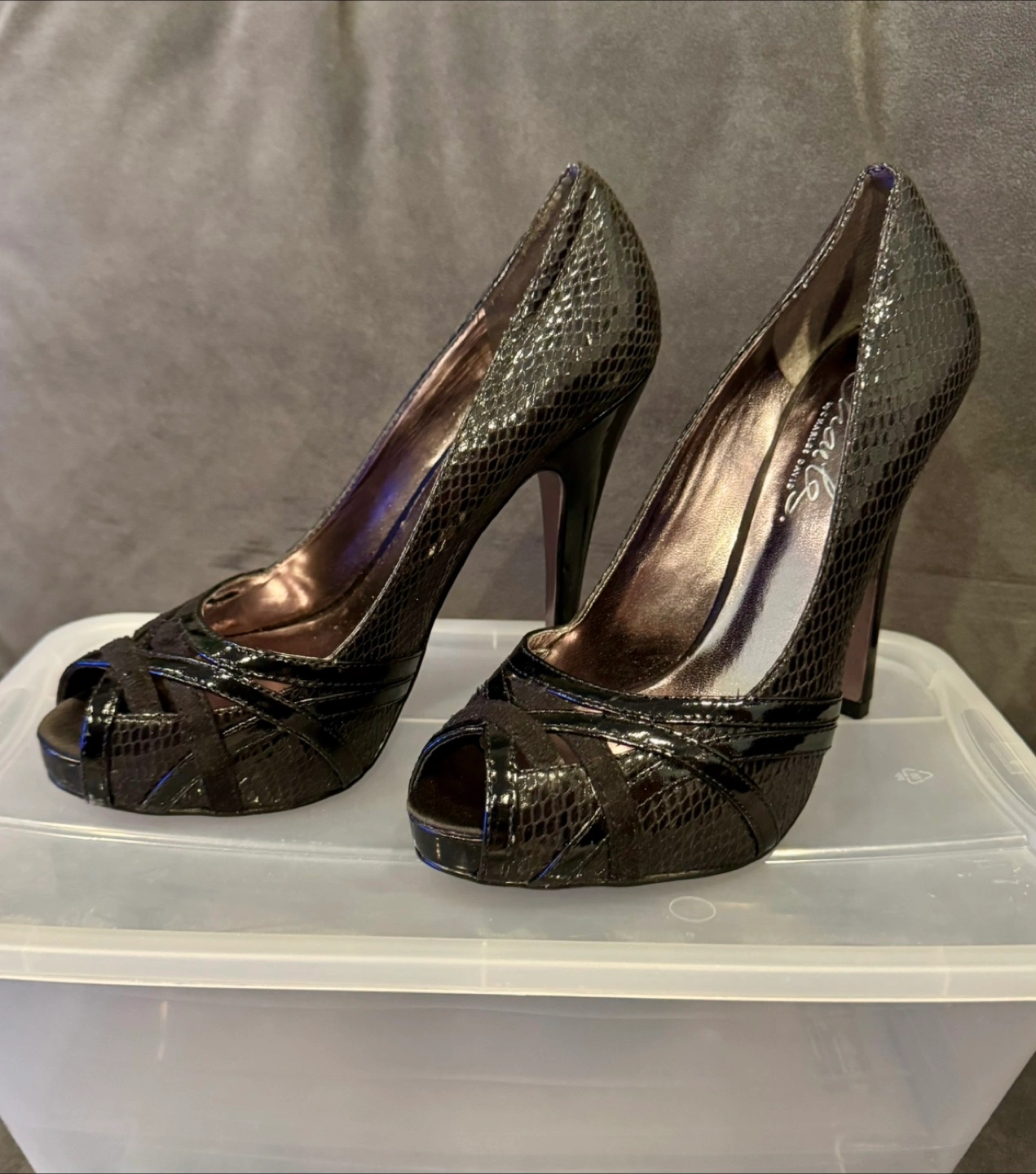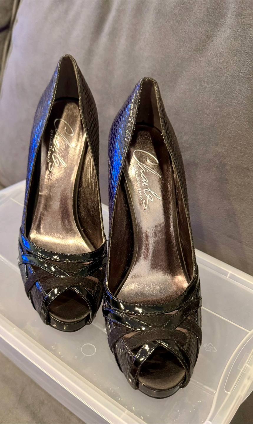 Beautiful Charles David black peep-toe heels. Snakeskin print. 5 inch heels. Cross-strap detail. Size 7. Worn twice, excellent condition.