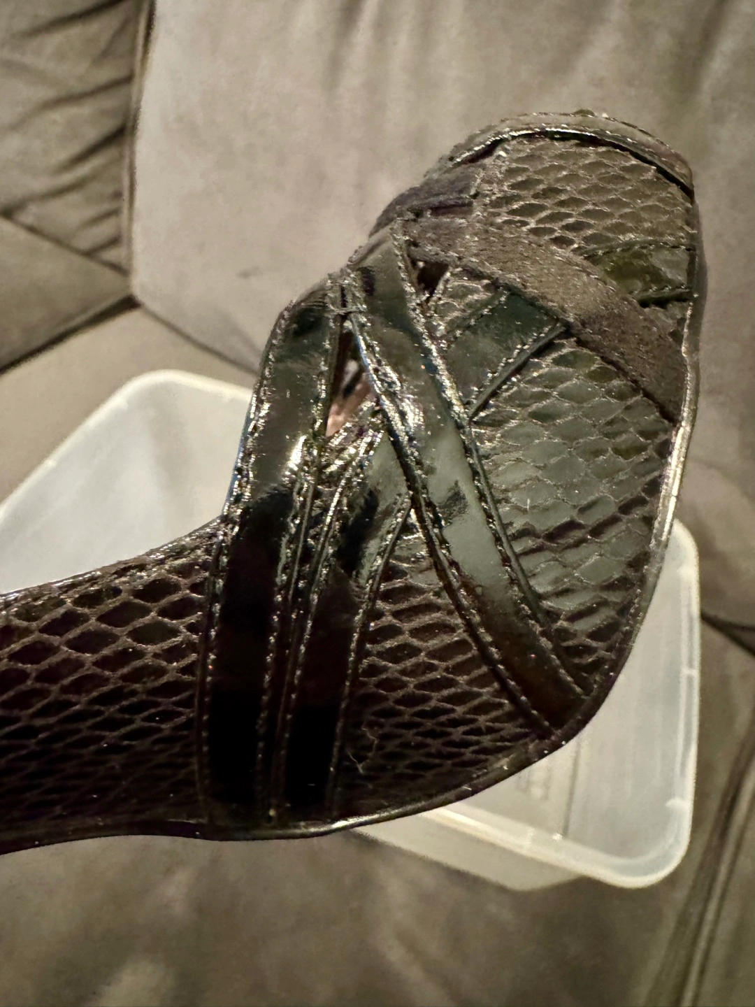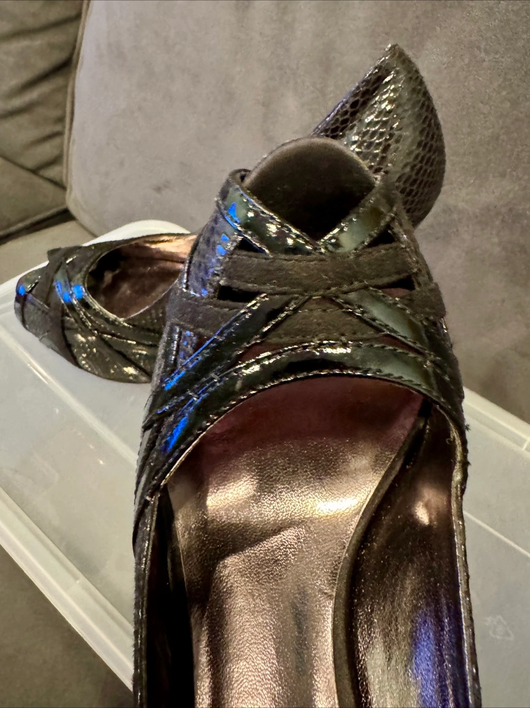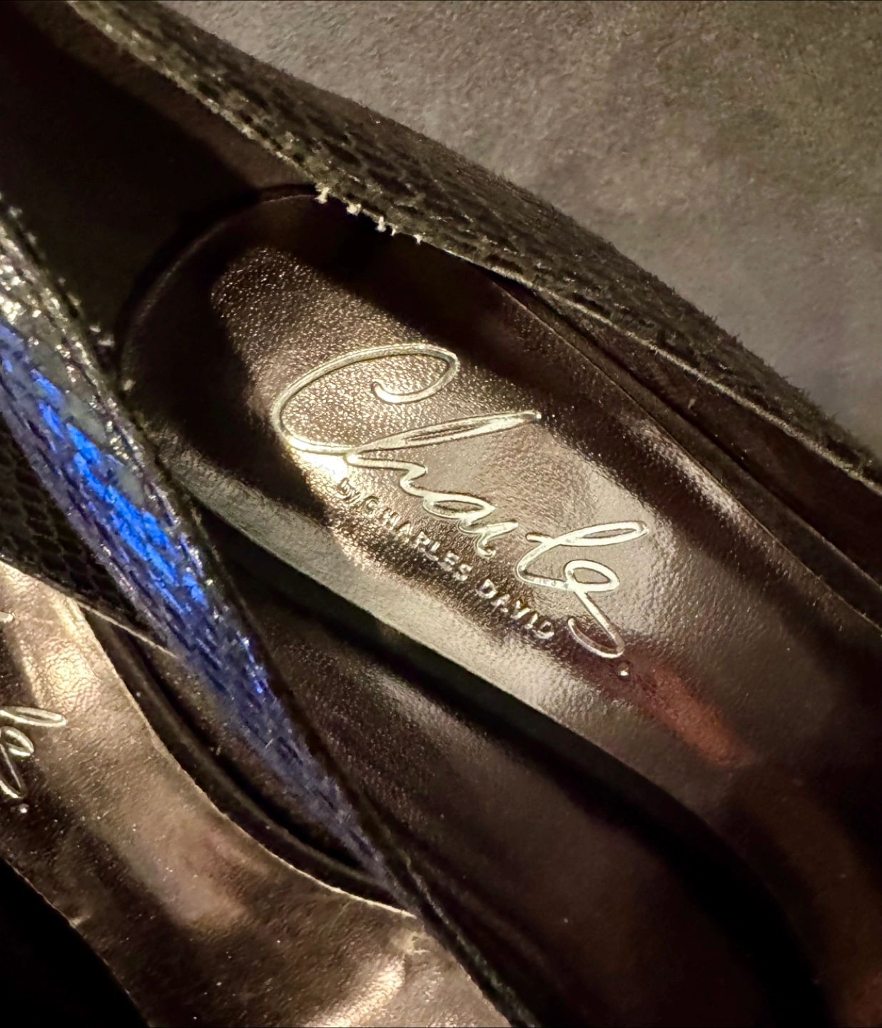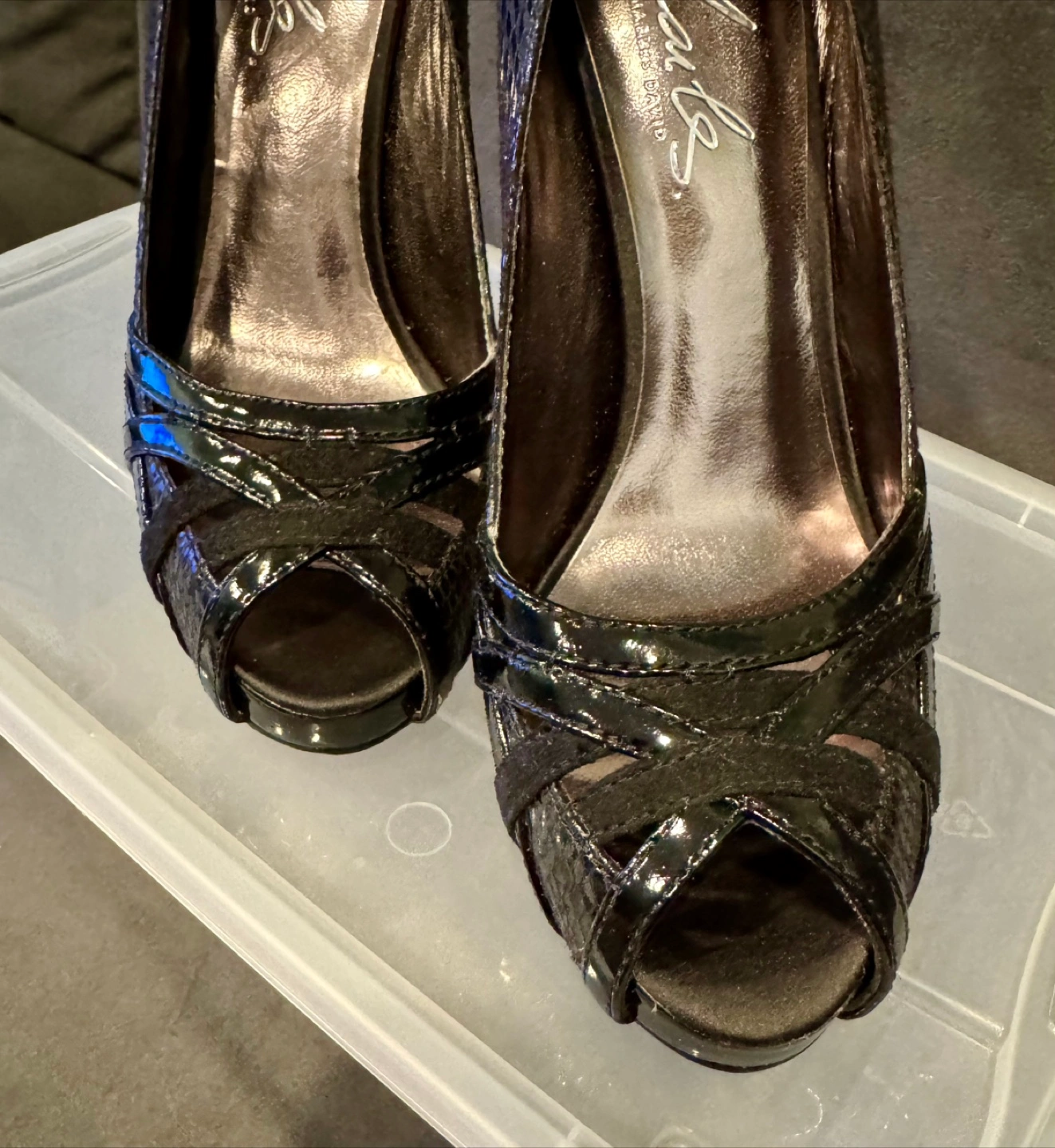 Beautiful Charles David black peep-toe heels. Snakeskin print. 5 inch heels. Cross-strap detail. Size 7. Worn twice, excellent condition.