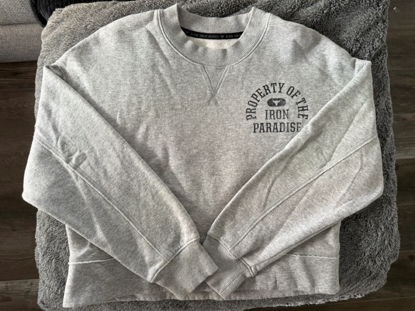 Grey crewneck sweatshirt with "Property of the Iron Paradise" graphic. It's made of a comfortable cotton blend. This sweatshirt is perfect for gym wear or casual outings.