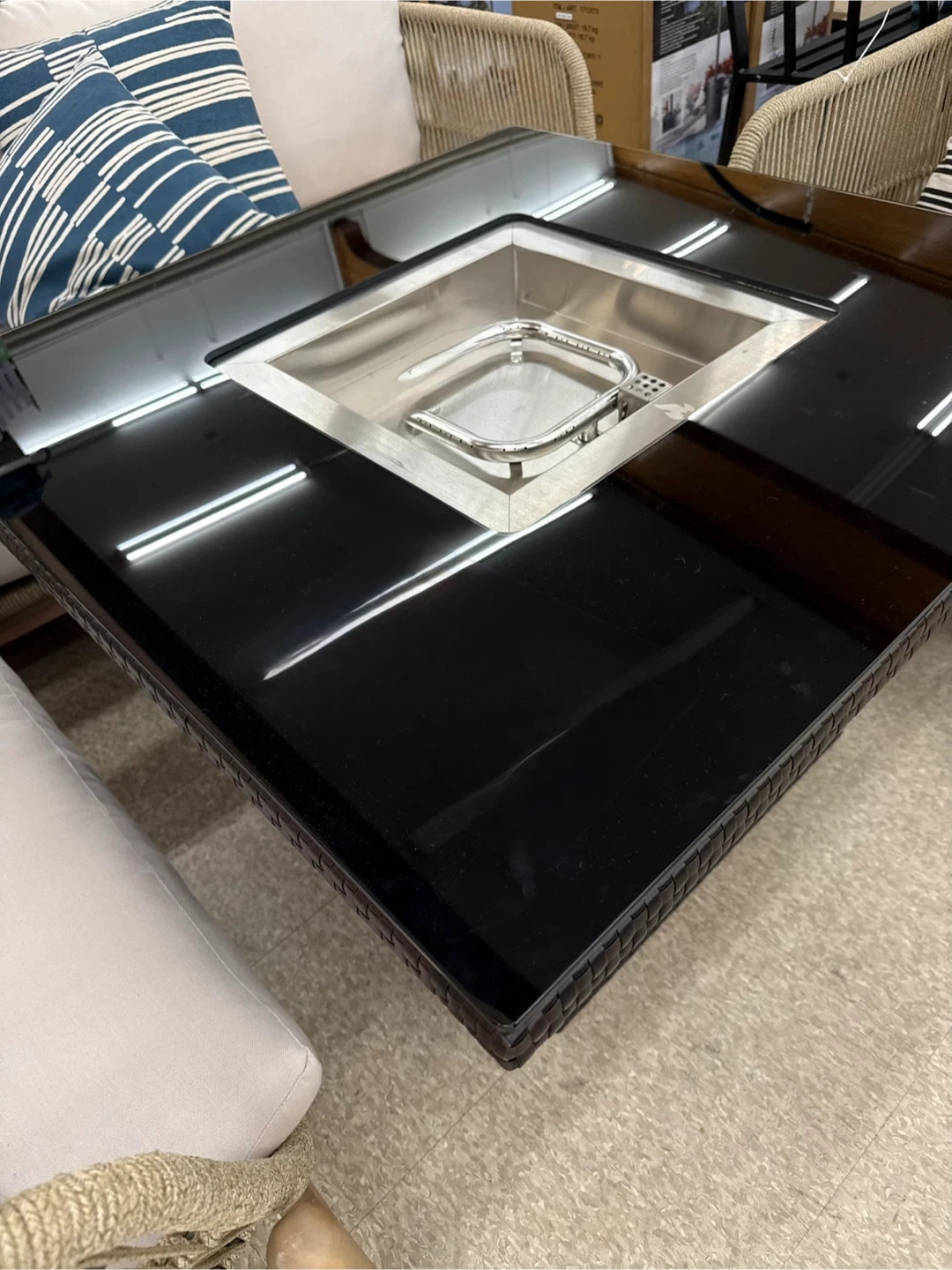 This fire pit dining table has a sleek black glass top and a wicker base. It's perfect for your backyard patio. Includes a stainless steel burner assembly.