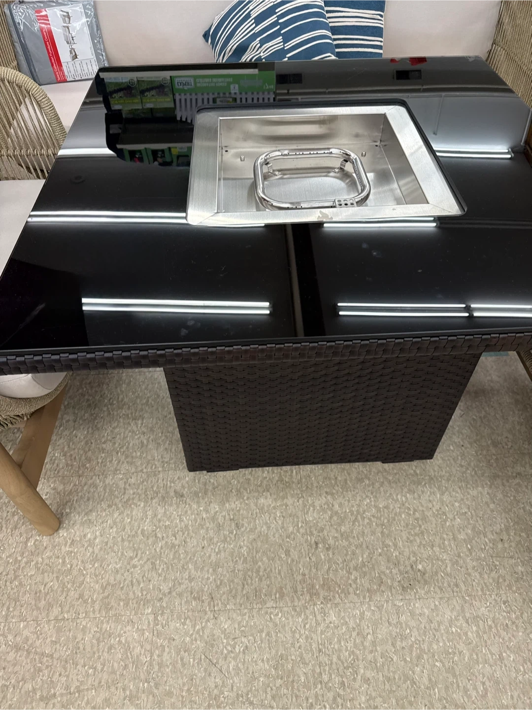 This fire pit dining table has a sleek black glass top and a wicker base. It's perfect for your backyard patio. Includes a stainless steel burner assembly.
