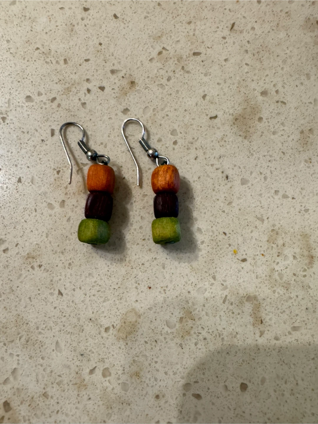 Here's a pair of handmade dangle earrings! They feature stacked wood beads in orange, brown, and green. These earrings are in great condition and would add a fun pop of colour to any outfit