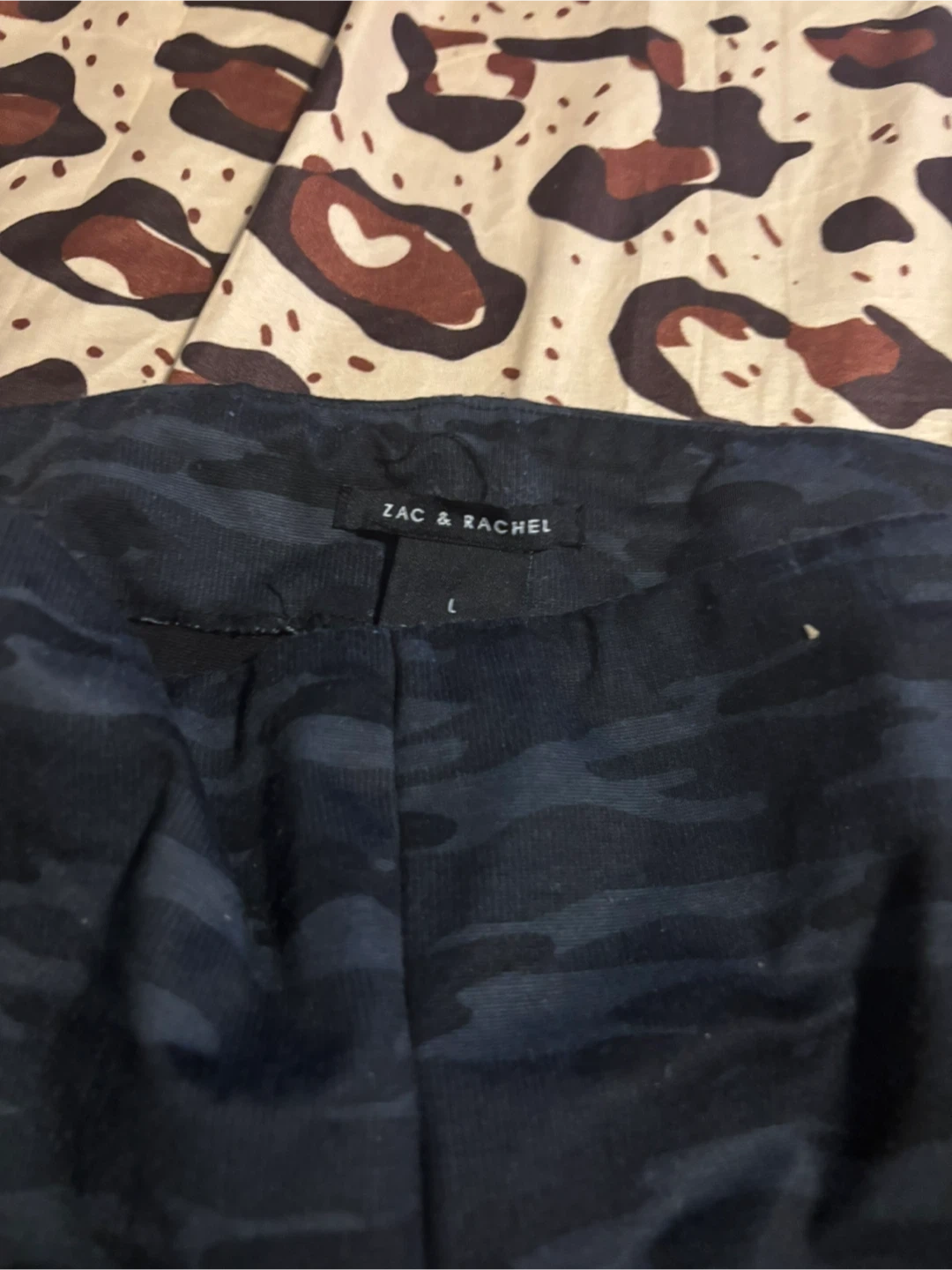 These are Zac & Rachel camouflage pants. They're a size large with a dark camo print. Comfortable knit fabric.