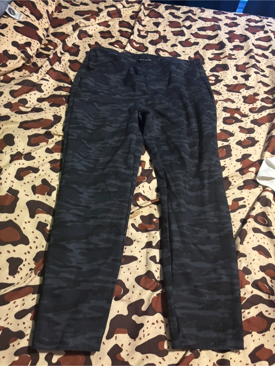 These are Zac & Rachel camouflage pants. They're a size large with a dark camo print. Comfortable knit fabric.