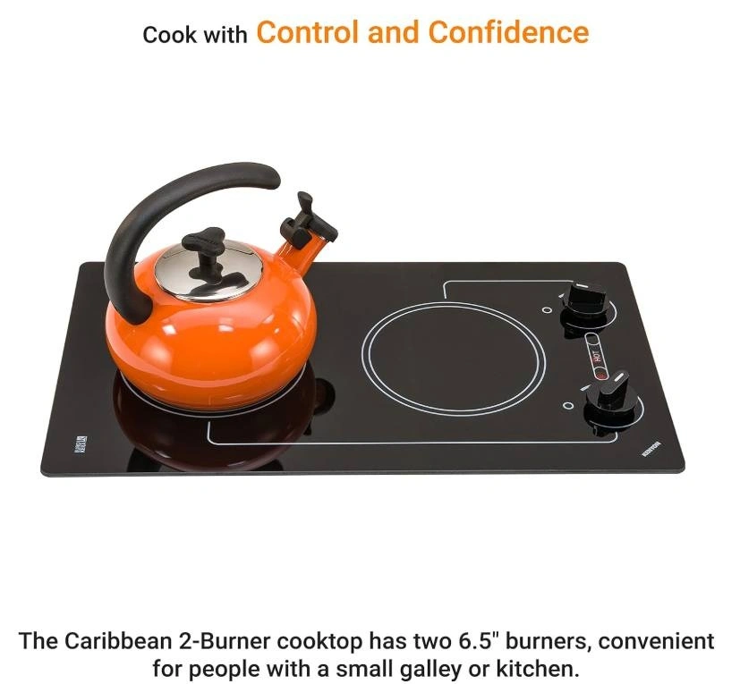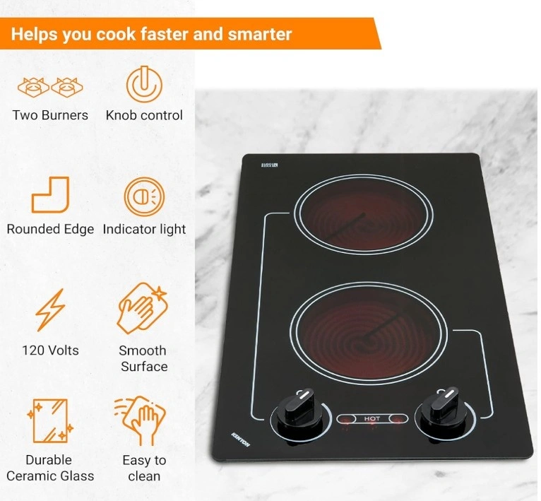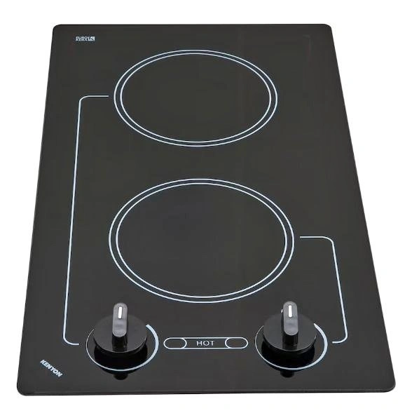 Enjoy efficient cooking with this Kenyon B41601 Caribbean 2-Burner Cooktop. It features a sleek black glass surface and effortless operation. Crafted from durable ceramic glass, this 120V cooktop includes safety features like heat-limiting cooking surface and ON/HOT burner indicator lights. With push-to-turn knob controls and infinite heat control, you can easily adjust the heat. The quick-to-heat radiant elements ensure even cooking. Designed to fit a standard countertop cutout, its smooth black glass with white graphics offers a modern look. Let me know if you're interested!