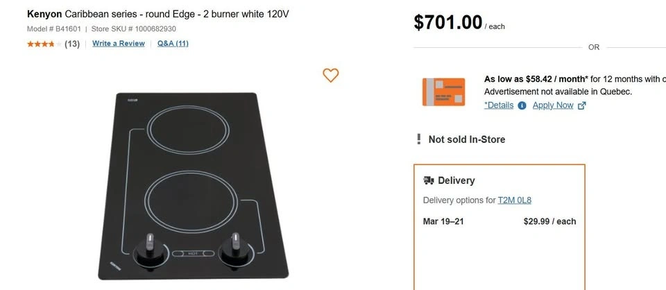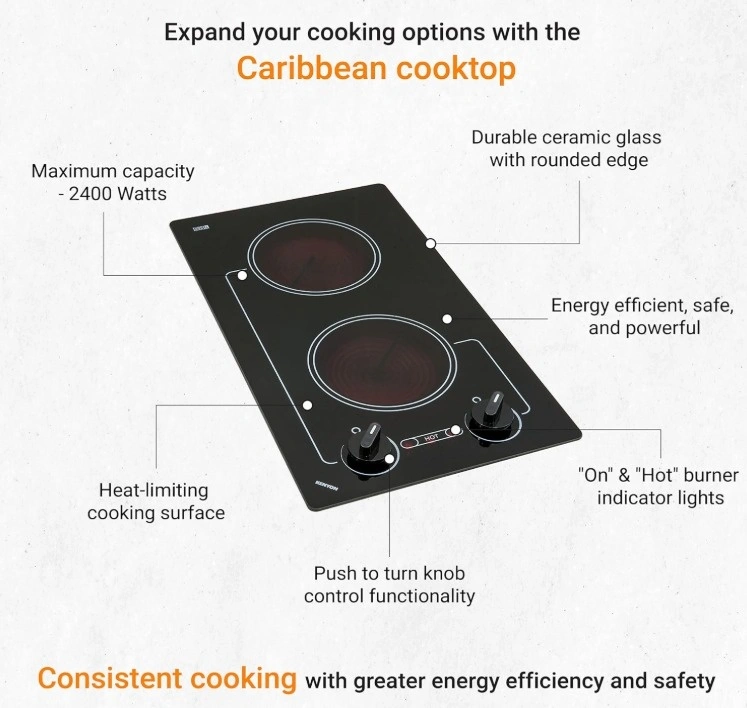 Enjoy efficient cooking with this Kenyon B41601 Caribbean 2-Burner Cooktop. It features a sleek black glass surface and effortless operation. Crafted from durable ceramic glass, this 120V cooktop includes safety features like heat-limiting cooking surface and ON/HOT burner indicator lights. With push-to-turn knob controls and infinite heat control, you can easily adjust the heat. The quick-to-heat radiant elements ensure even cooking. Designed to fit a standard countertop cutout, its smooth black glass with white graphics offers a modern look. Let me know if you're interested!