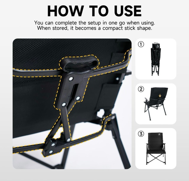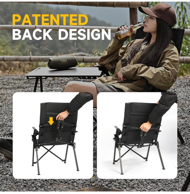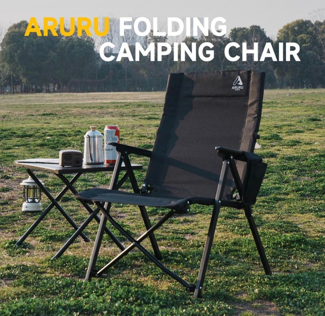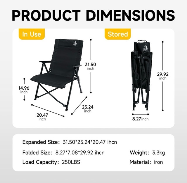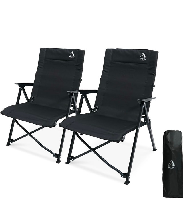 Selling a pair of ARURU folding camping chairs. They have a sturdy iron frame and a comfortable, high-back design. These chairs are new. Expanded Size: 31.50*25.24*20.47 inches. Folded Size: 8.27*7.08*29.92 inches. Weight: 3.3kg. Load Capacity: 250lbs. Material: iron. If the ad's still up, the chairs are still available.
