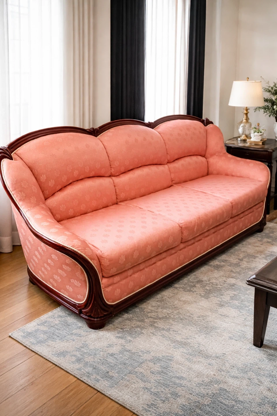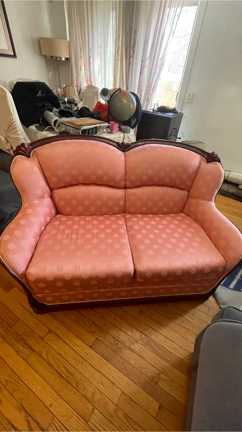 Elegant 3 piece living room set in a classic traditional style. The set includes a full size sofa, a loveseat, and a large comfortable armchair. All pieces feature a solid hardwood carved frame and matching salmon pink patterned upholstery that gives the set a warm timeless look.