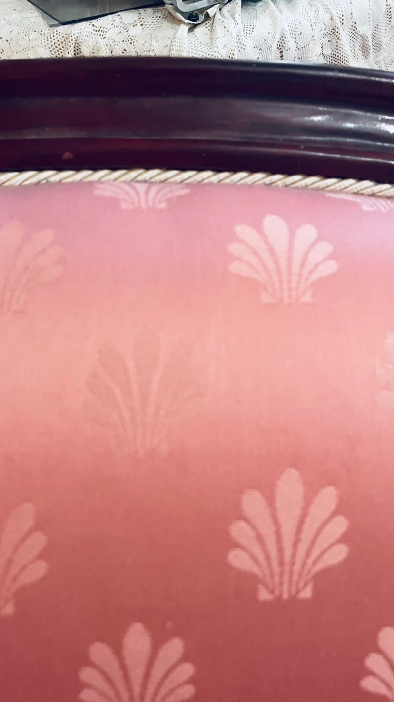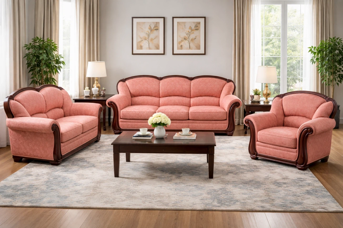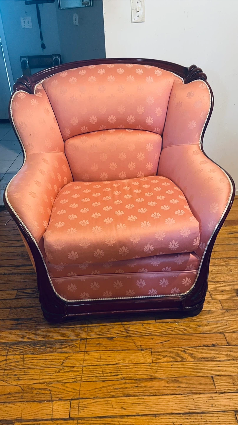 Elegant 3 piece living room set in a classic traditional style. The set includes a full size sofa, a loveseat, and a large comfortable armchair. All pieces feature a solid hardwood carved frame and matching salmon pink patterned upholstery that gives the set a warm timeless look.