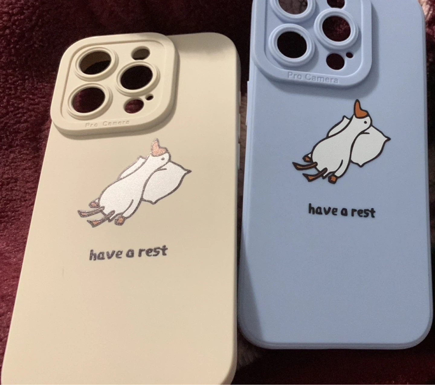 Protective phone cases with a cute goose design. Features "Pro Camera" text around the camera opening. Available in beige and light blue.