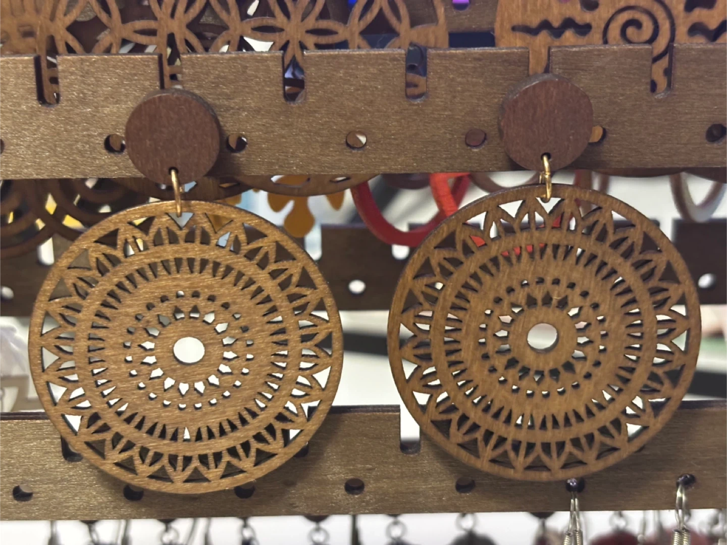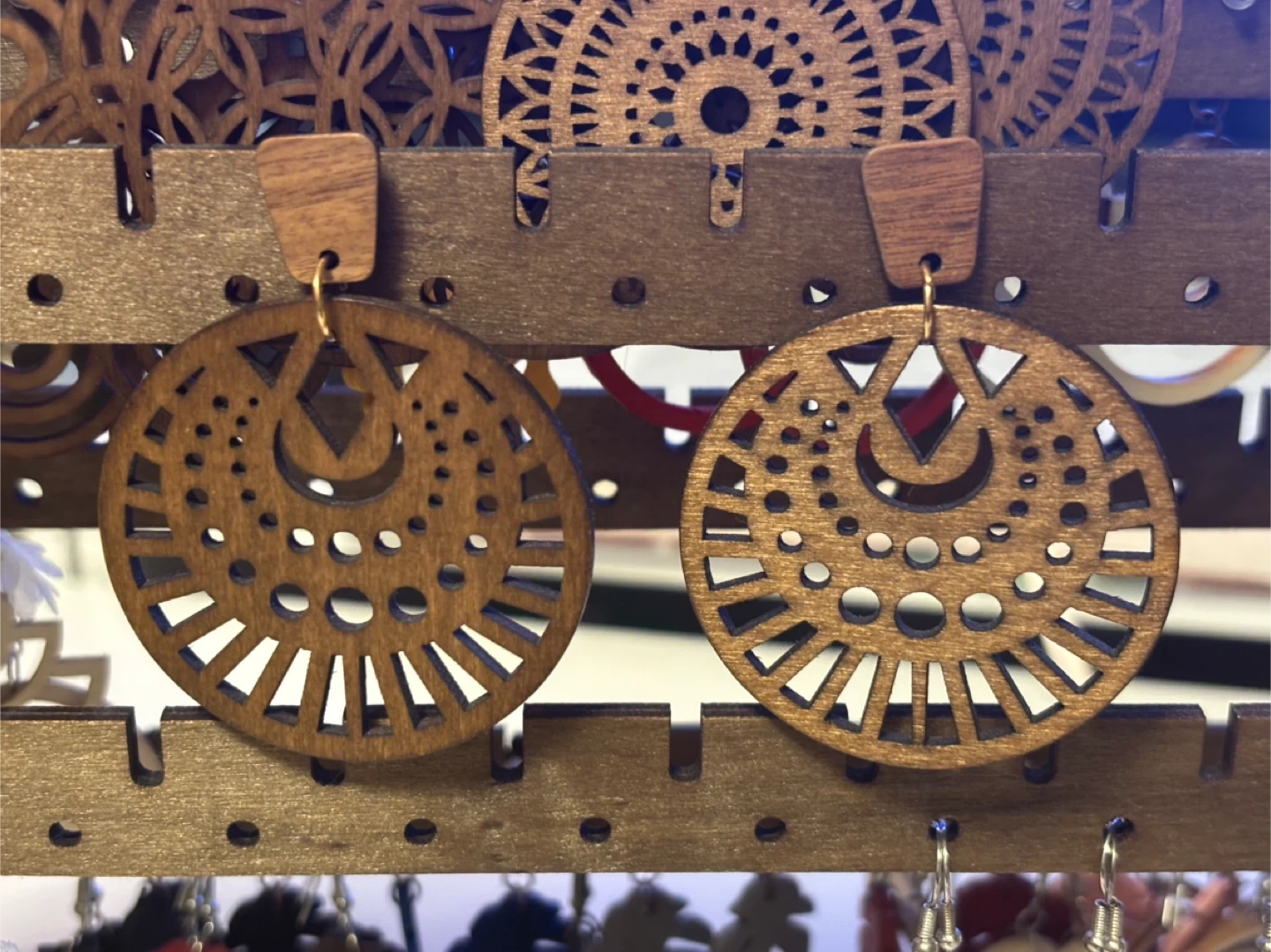 Cute wooden laser cut earrings. They're lightweight and have a natural wood finish. These are perfect for adding a unique touch to any outfit!