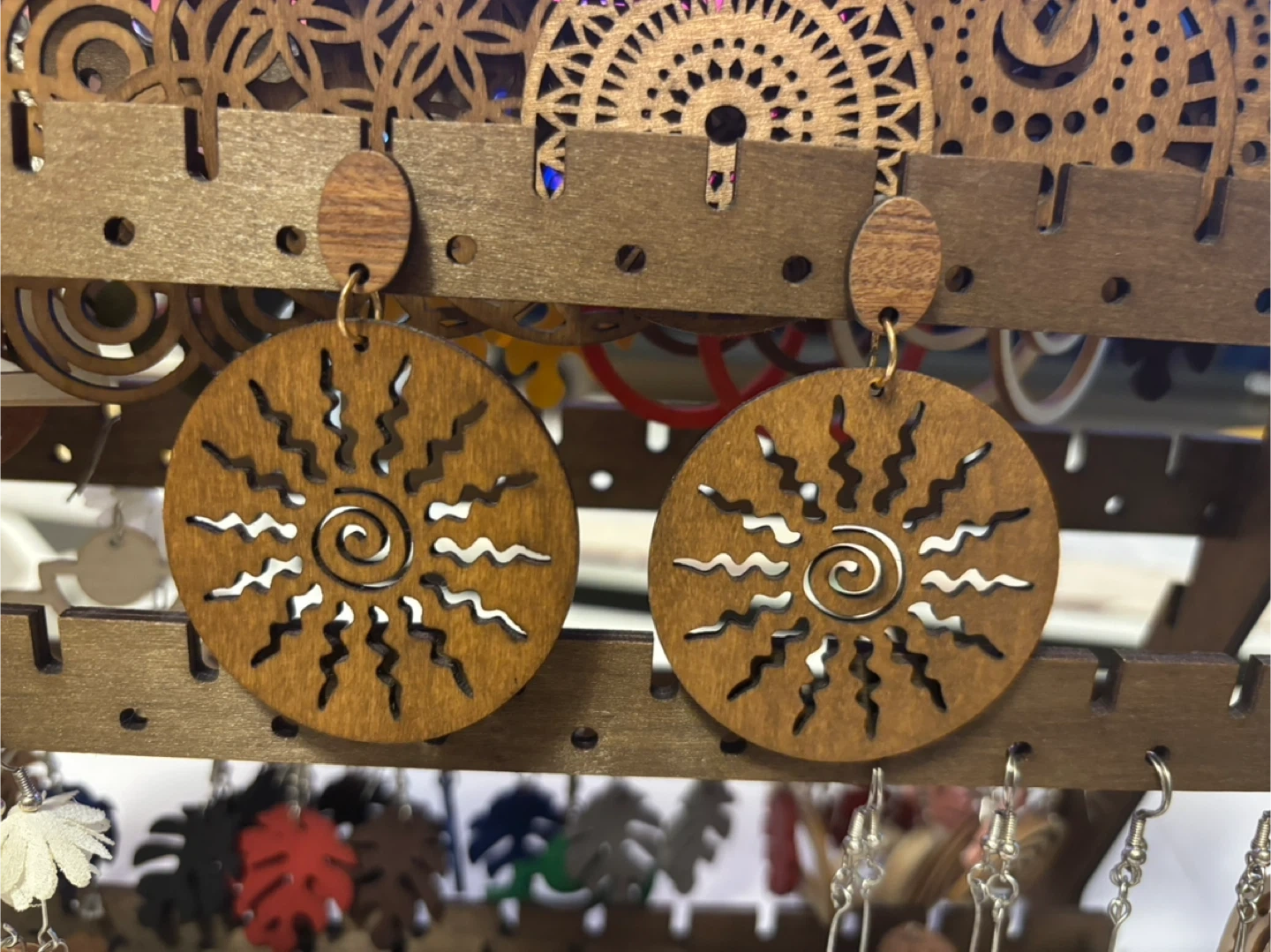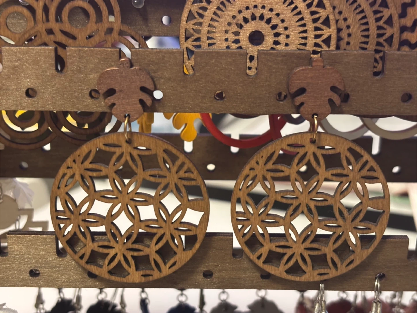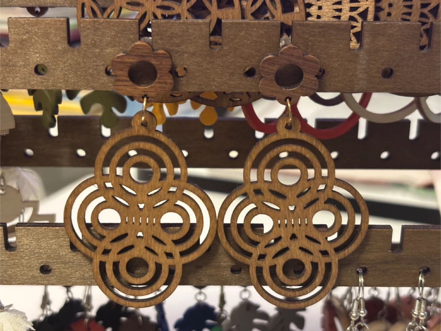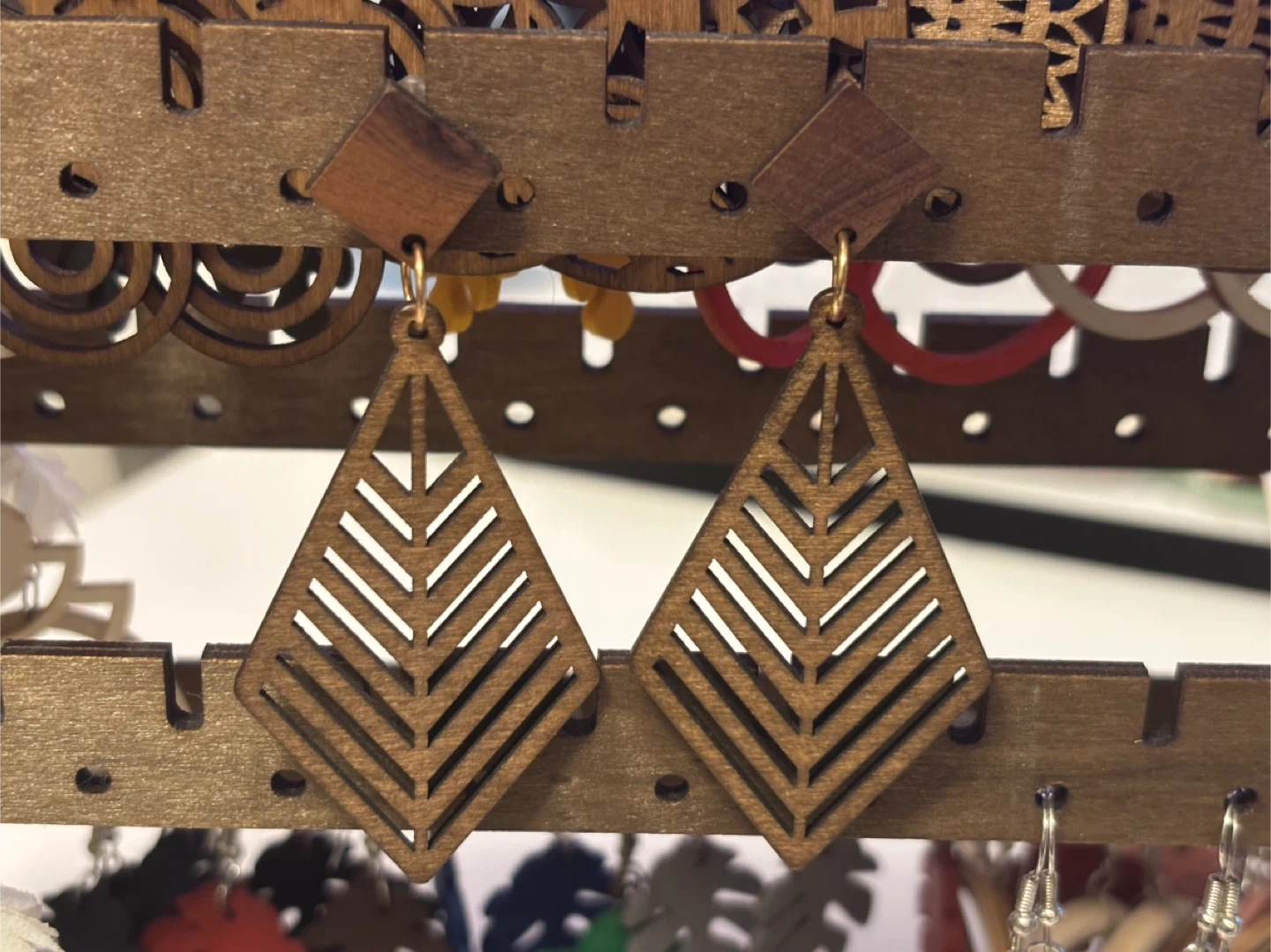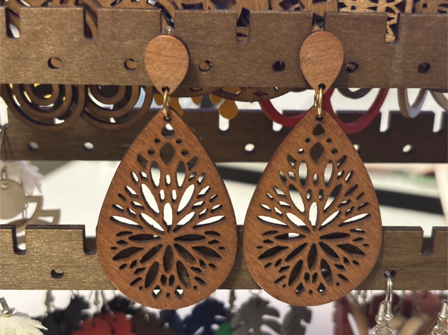 Cute wooden laser cut earrings. They're lightweight and have a natural wood finish. These are perfect for adding a unique touch to any outfit!
