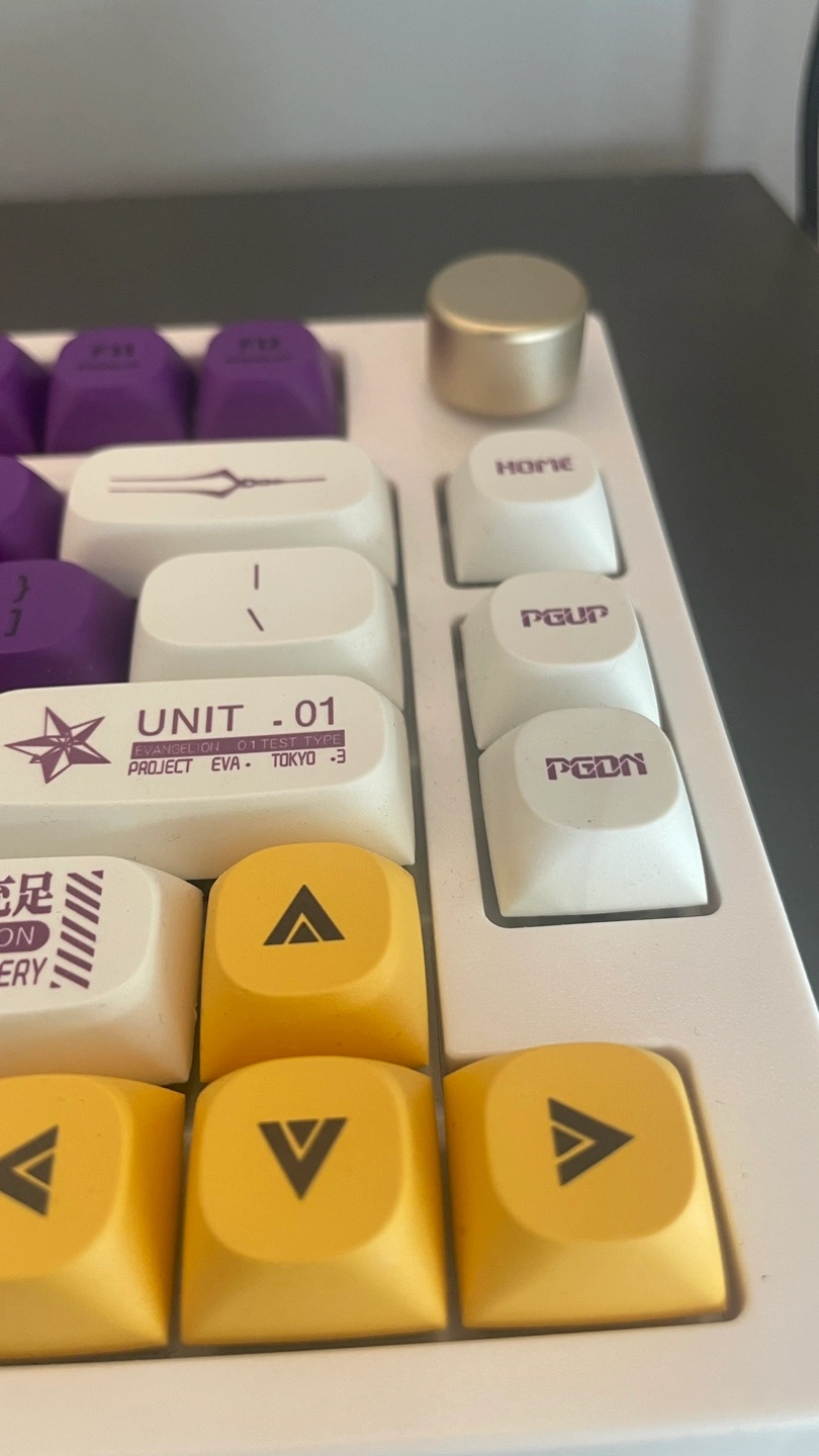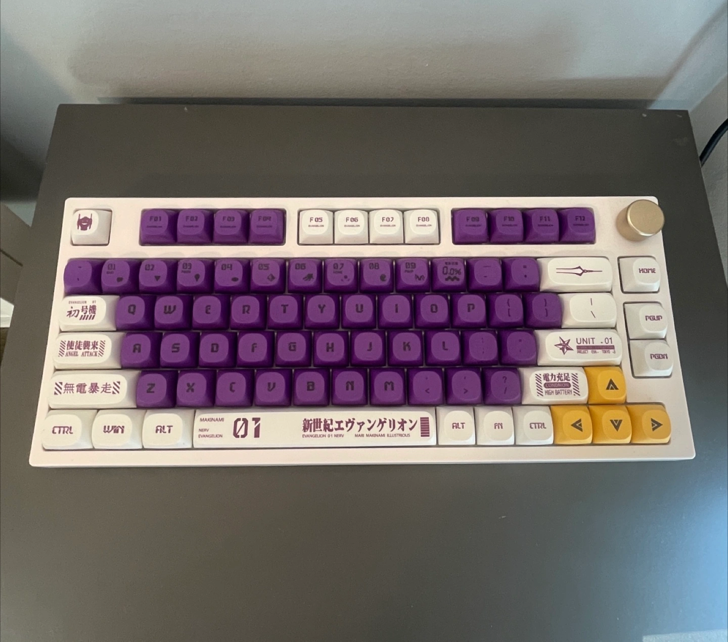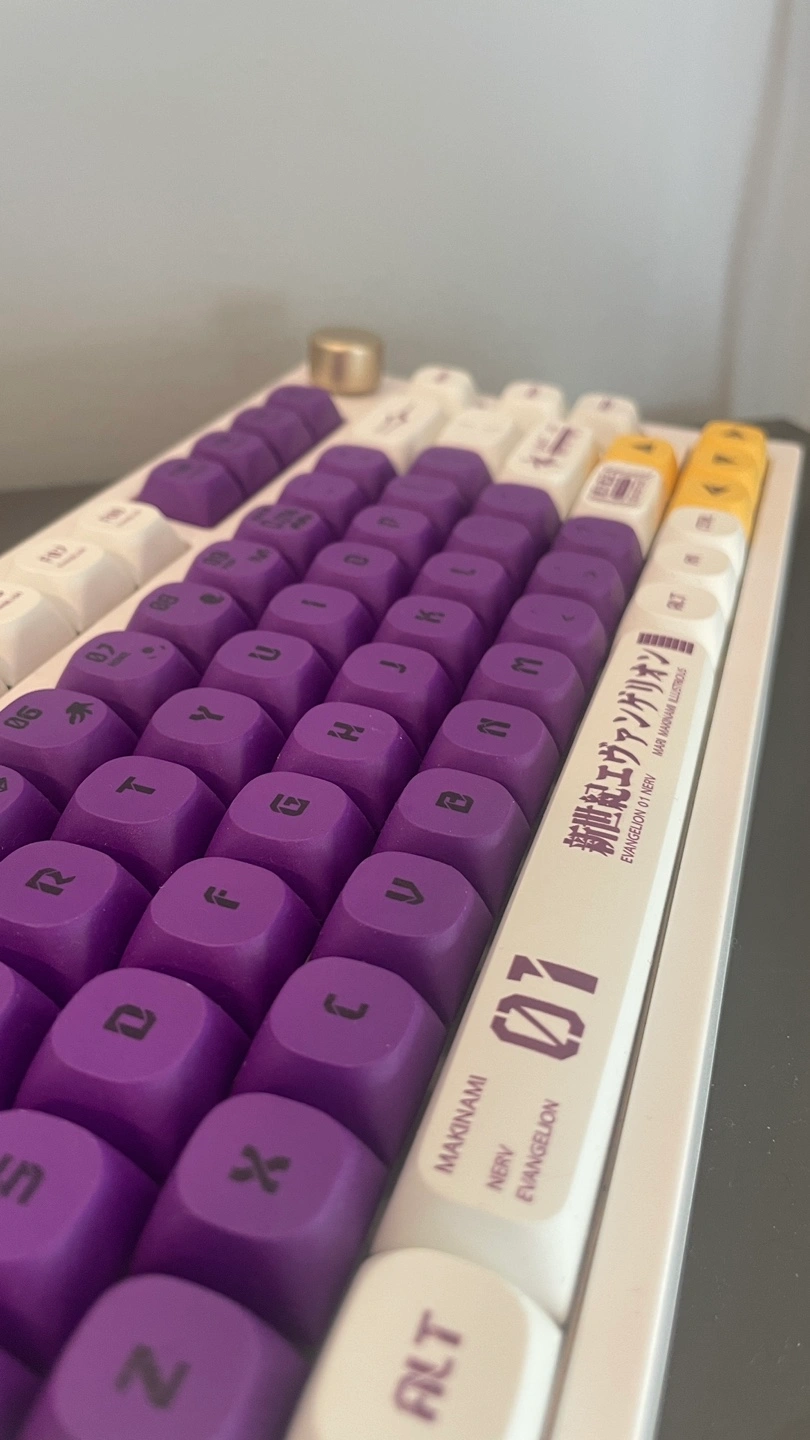 Custom mechanical keyboard featuring an Evangelion Unit-01 theme.